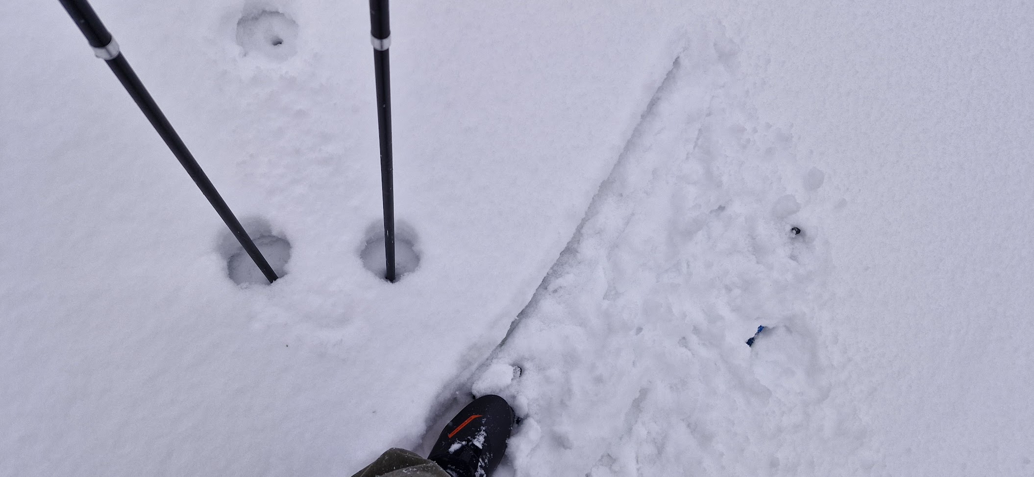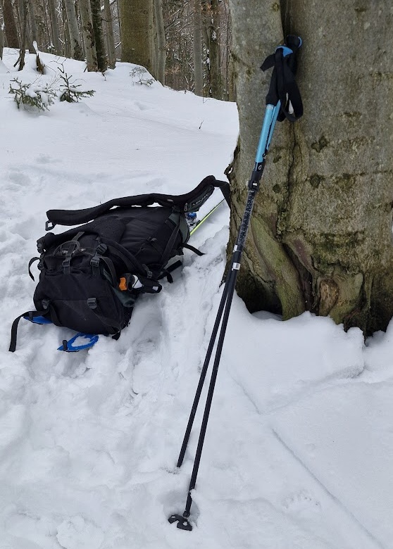 První pořádný odpočinek si dopřávám asi v polovině stoupání – je 13:30. Odepínám lyže, sundávám bágl a posazuju se na něj. Potřebuji utáhnout aretaci skládacích lyžařských hůlek, protože se mi při pořádném zapření zkracují. Cítím, jak jsem se na zádech hezky během stoupání hezky potil.