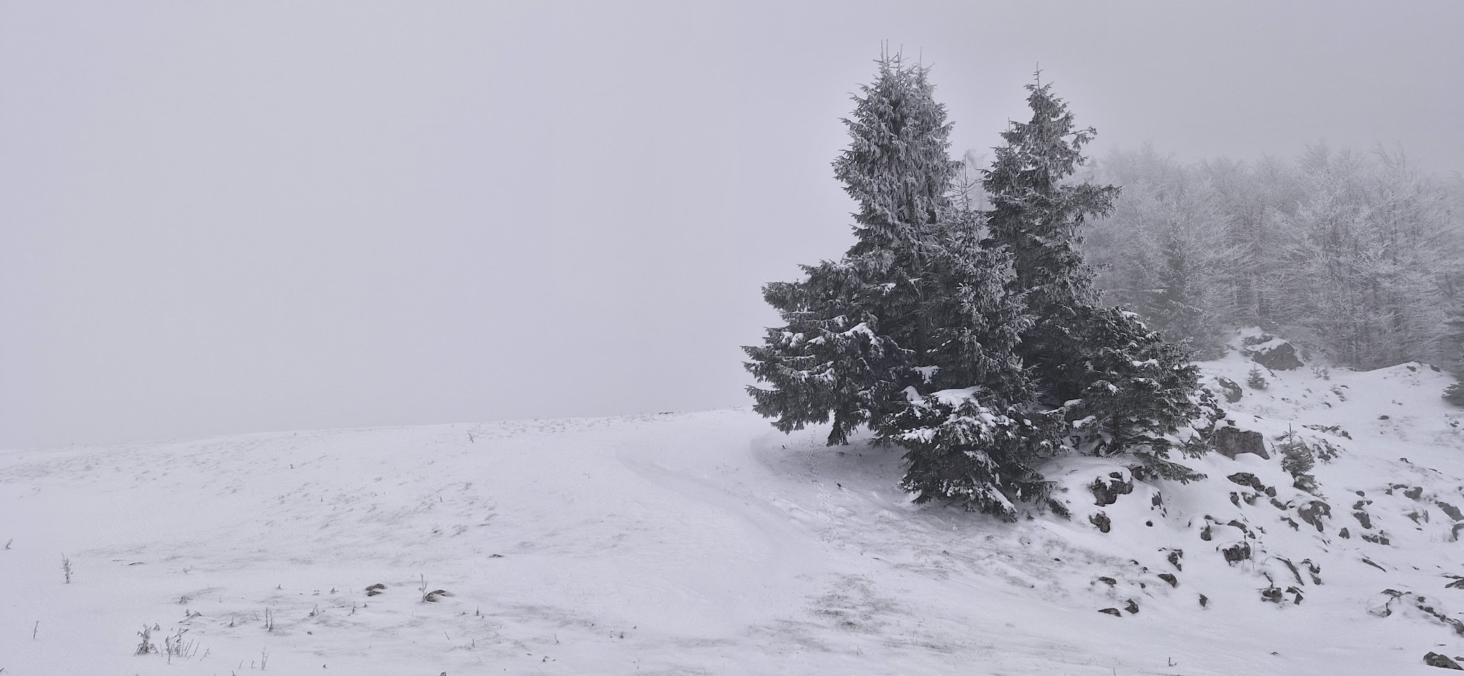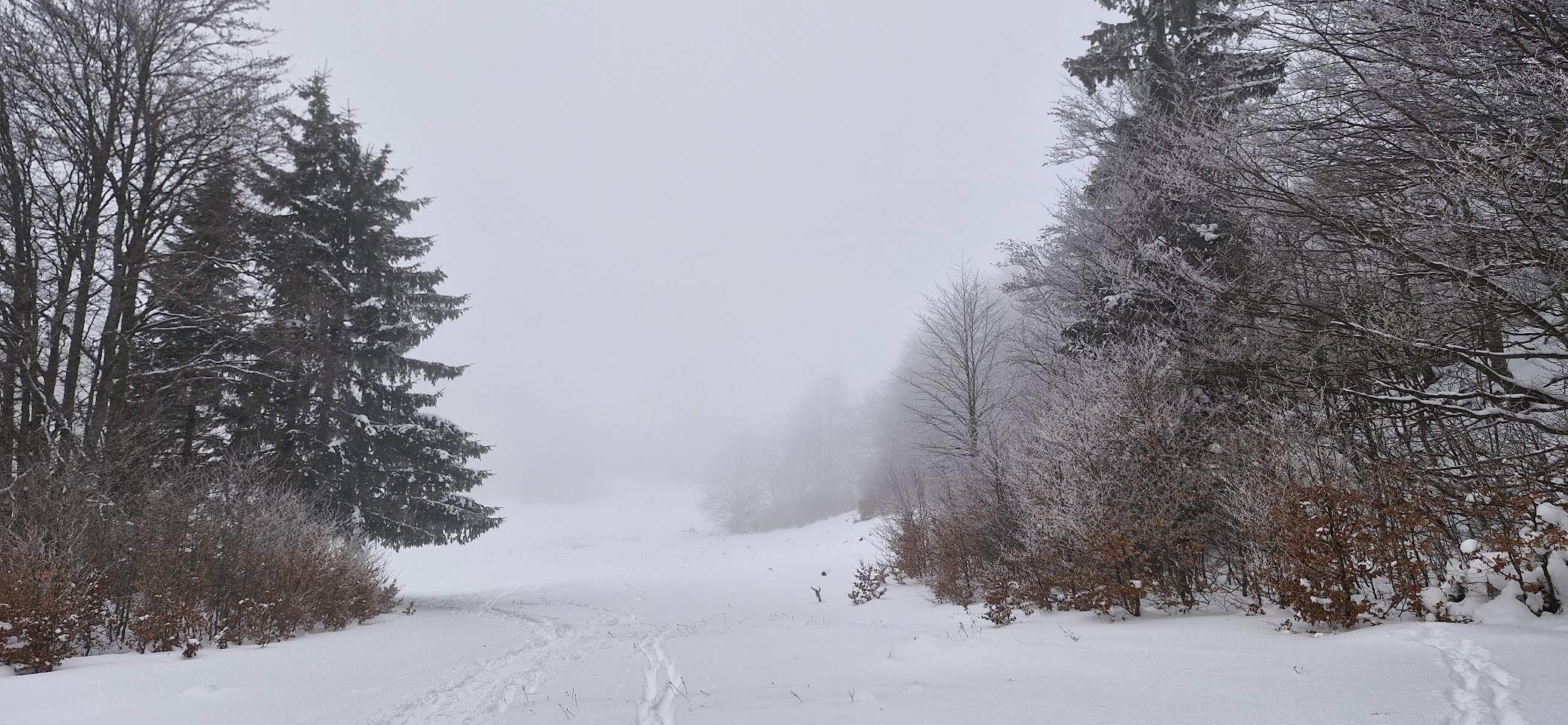 Počasí je mlhavé, sněží, mráz -8 °C, ale zvládám to. Jde to zřejmě pomaleji než by to trvalo zdatnějšímu skialpinistovi, ale dolů u auta jsem v 8:40, tedy cca půldruhé hodiny po té, co jsem vyrazil od Koniarky.