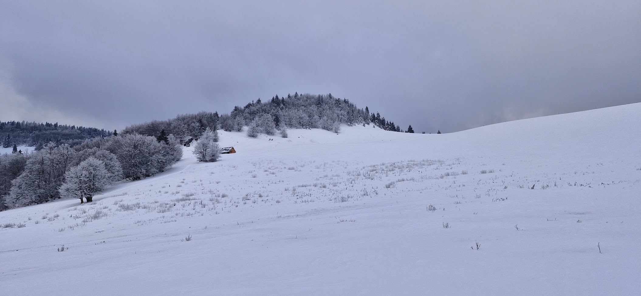 Od okraje lesa k maringotce pro baču, která bývá přes zimu volně přístupná, to je necelá čtvrt hodinka. Je asi 150 metrů napravo, mimo značku. Je menší než stará koliba Chyžka, vítr tu fouká výrazně víc, ale skoro nikdo sem nezabloudí. Alespoň já jsem se tu zatím nikdy s nikým v tento čas nepotkal.