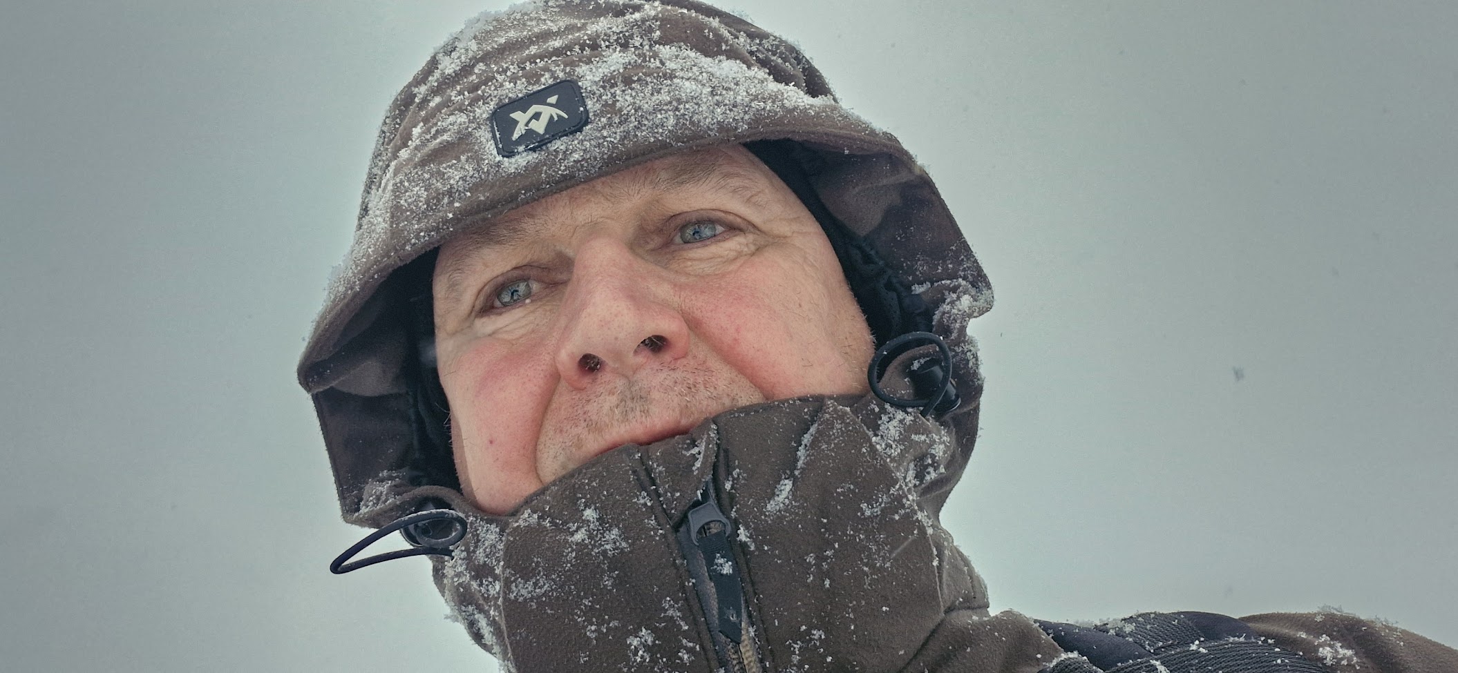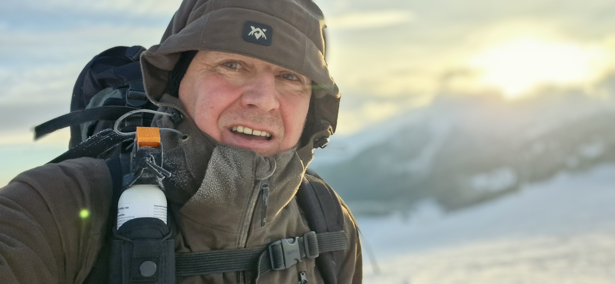 15:20 je „hranice slunce“ dosažena. Po pořízené fotek a videozáběrů vážně uvažuju, zda bych neměl sundat bágl a vytáhnout z něj kvalitní kožené lyžařské rukavice, kterou s sebou beru do extrémů a vyměnit je za ty co mám na sobě – dvoje prstové rukavice na sobě – jedny z Temu jedny flaušové pracovní. Ve městě si vždycky vystačím s nimi, i dole v údolí to šlo, ale tady na hřebeni platí jiné zákony přežití. Taky mám v báglu chemický zahřívací pytlík a premiérově s sebou táhnu USB zahřívače rukou (z Temu).