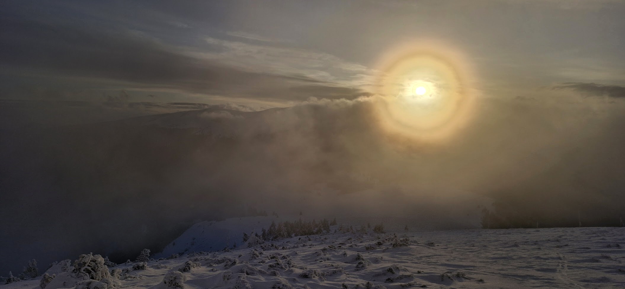 Letos to vypadá na kombinaci všeho :- ) Viditelnost je velmi malá, vítr nezanedbatelný a zima tak o 2-3 stupně větší než dole v údolí. Poznám to mimo jiné proto, že už se nepotím. Každá pořízená fotka nebo videozáběr je opět vykoupený dlouhým zahříváním rukou. Tenhle víkend těch fotek bude holt méně :- (