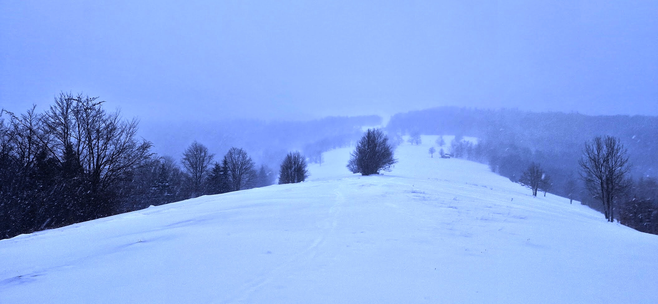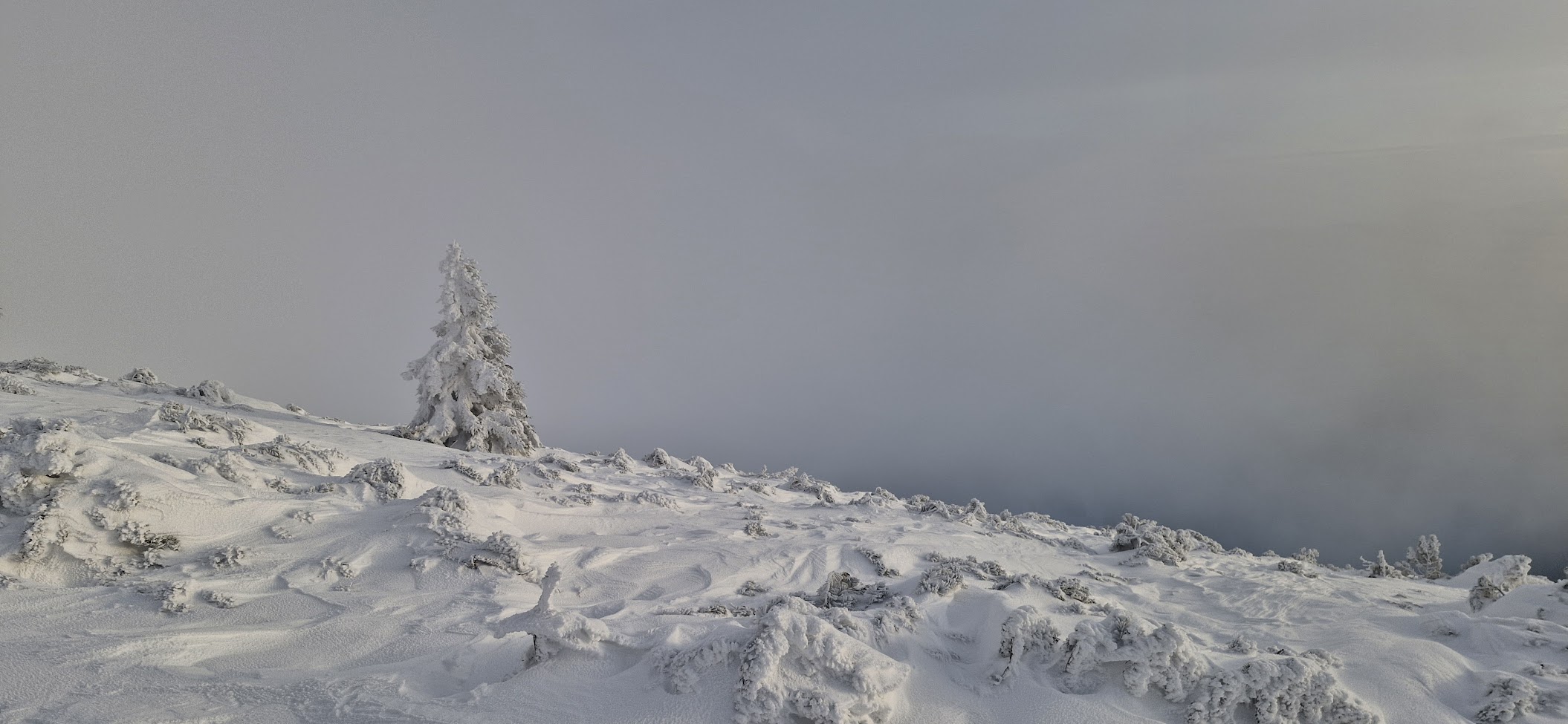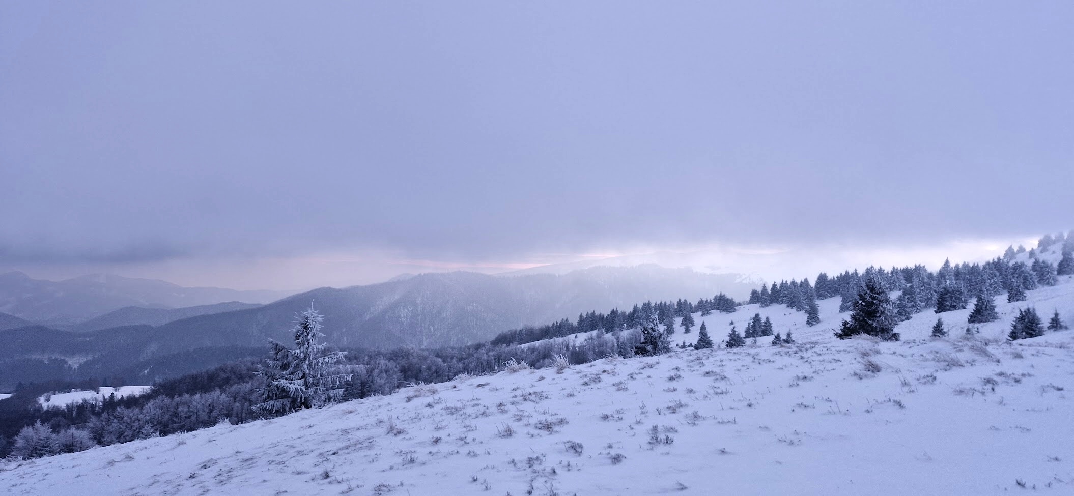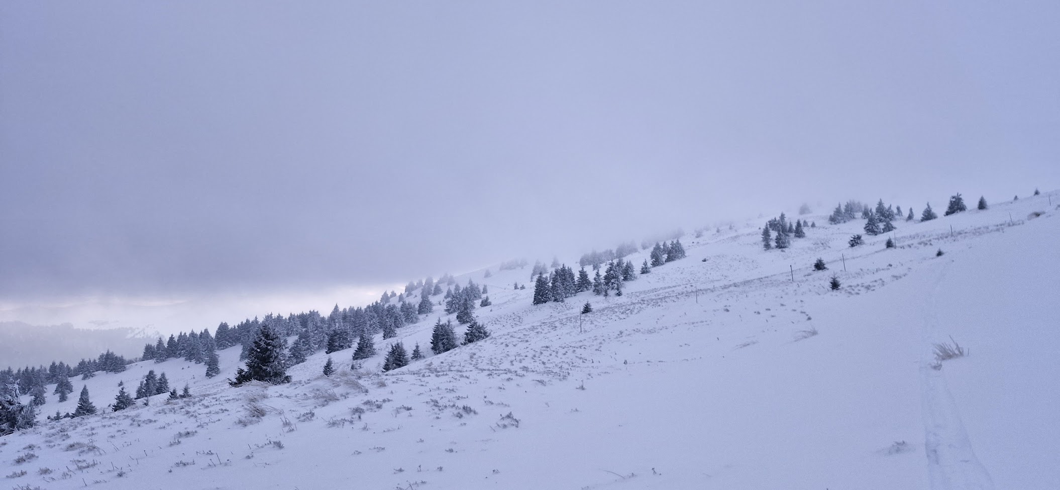Tady se už místy vyskytují osamocené smrčky a fouká tu trošku méně než na zcela otevřeném svahu. Ale zašlo slunce a v kombinaci s těžkými šedými sněhovými mraky se začíná nad krajinou šeřit.