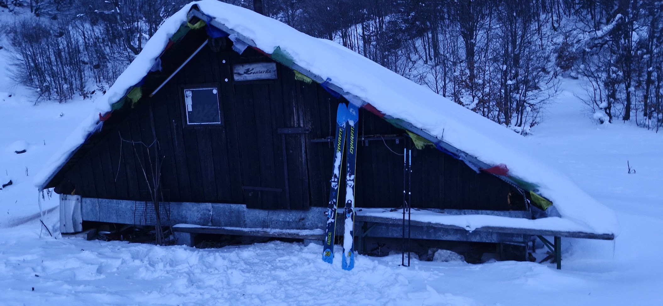 Je 16:35, když přijíždím ke Koniarce. Je to jedna z méně známých útulní na Velké Fatře. Na vrchol Čierneho kameňa (1469 m. n. m.) je to odsud vzdušnou čarou necelého půl kilometru. Samotná útulňa je v nadmořské výšce přibližně 1276 m n. m. Tohle místo je ideální pro legální zimní přenocování v Národním parku Velká Fatra. Objevil jsem jej teprve předloni.