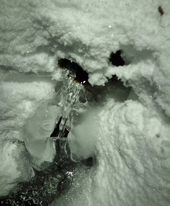 V závěji sněhu se mi daří pramínek najít a i když je skoro celý zamrzlý, daří se mi s menší obtíží ešus naplnit. Tady v lese je trochu tišeji než na louce na které útulňa stojí a tak si chvíli užívám toho klidu než se vydám ve svých stopách hlubokým sněhem zpátky.