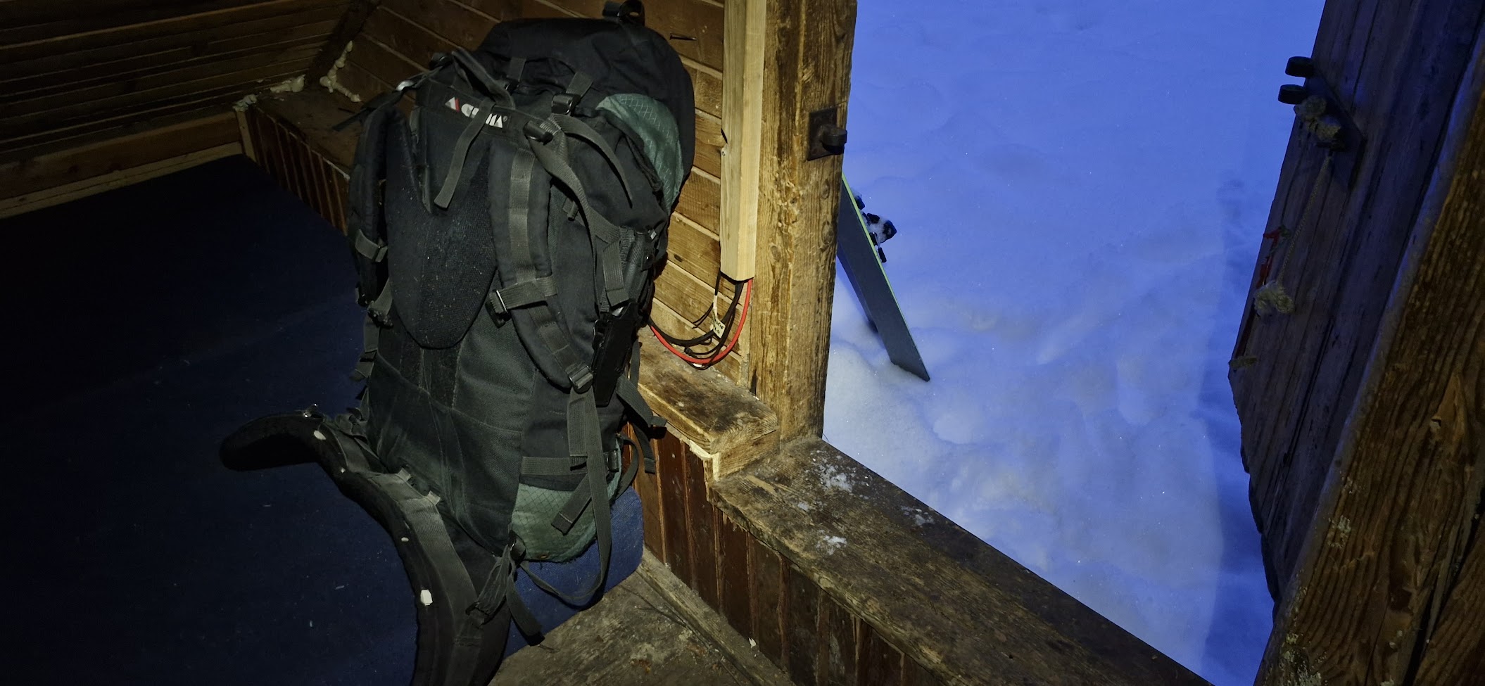 Sundávám lyže a opírám je i s hůlkami o stěnu útulně, ometám od sněhu bágl i bundu a lezu dovnitř. I když je vnitřek promrzlý, je tu násobně tepleji než venku. Vytahuji čelovku, zapalovač a zatápím v místních kamínkách. Naštěstí tu je nachystané trošku dřeva, a i když tu nejsou třísky, je tu trocha drobnějších bukových větévek, které lze na zátop použít.
