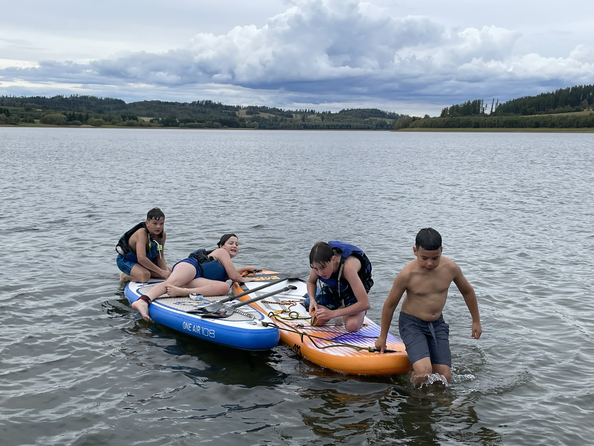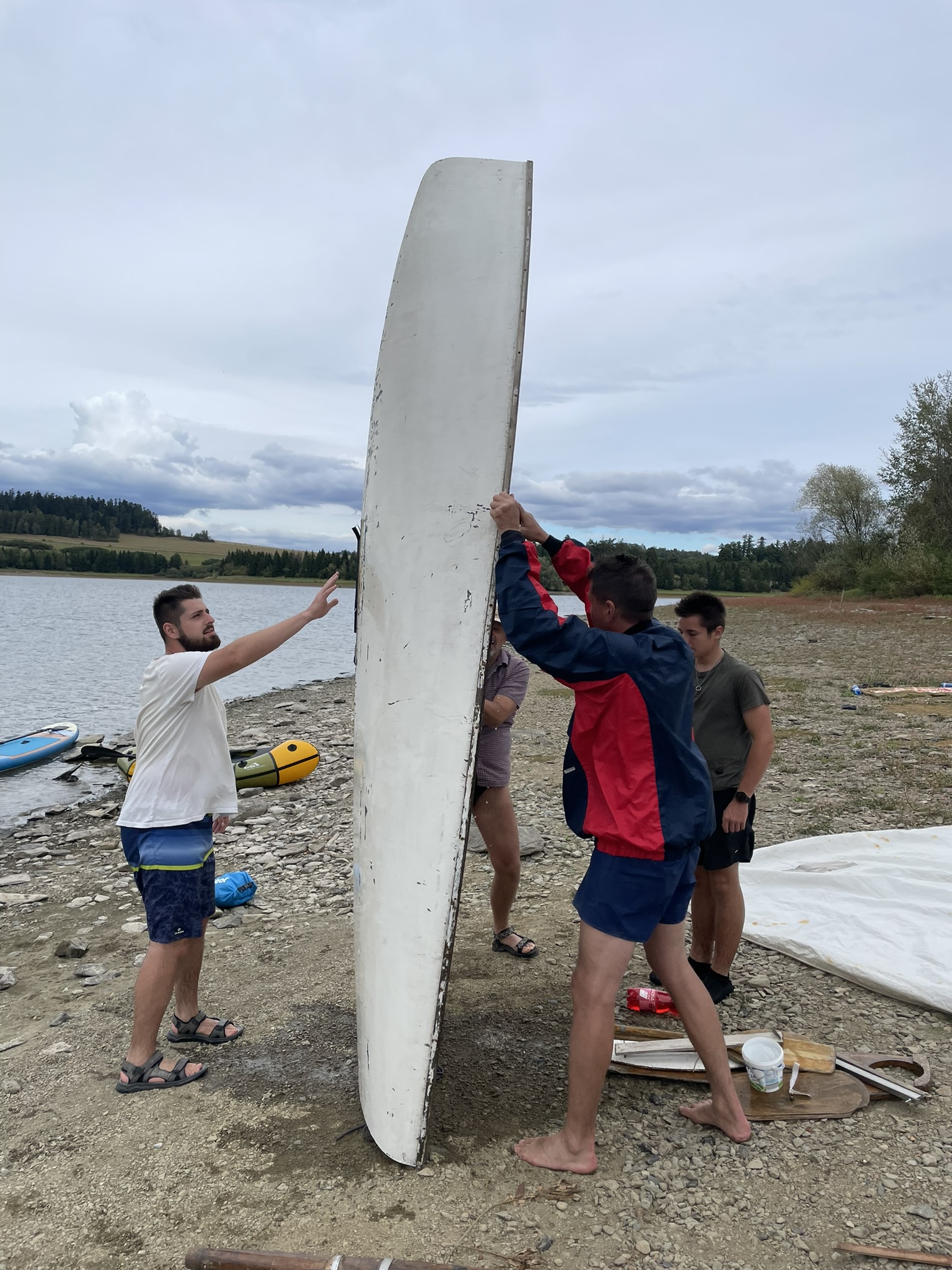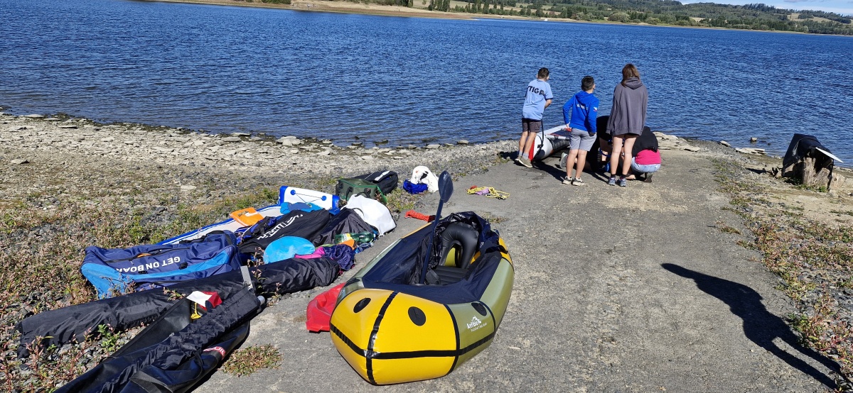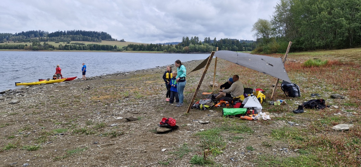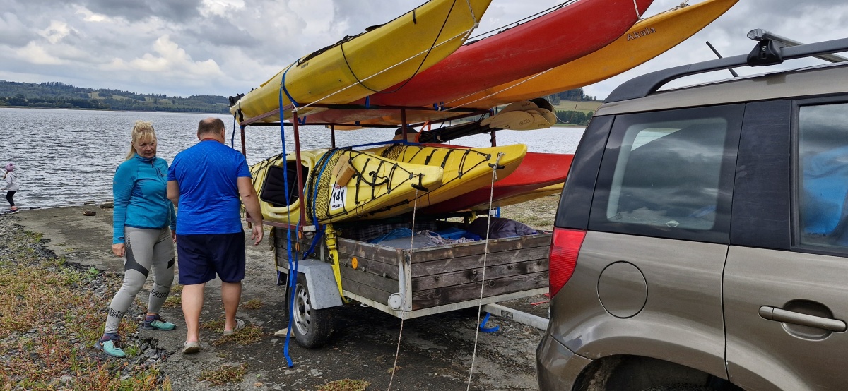 K místu setkání přijíždíme s Kájou jako první. Závora je otevřená, protože se bourá tábor vodních skautů, odvážejí stanové podsady a všechno vybavení. Domlouvám se s vůdkyní oddílu, který si tábořiště pronajímá od Povodí Odry, že mohu s autem sjet po asfaltové cestě až k okraji vodní plochy, kde vyložím svůj náklad a auto zaparkuji nad závorou. Šetří mi to minimálně půlhodinu času na přenášení rozloženého katamaranu, paddleboardů a packraftu.