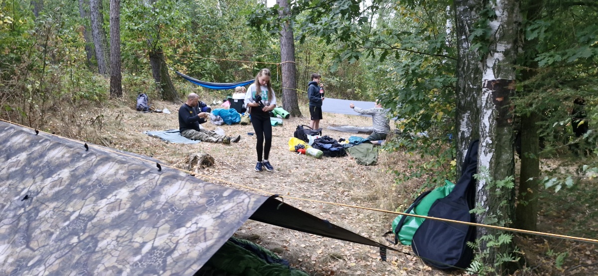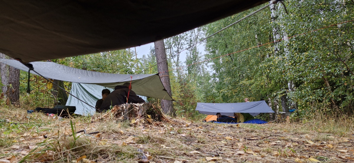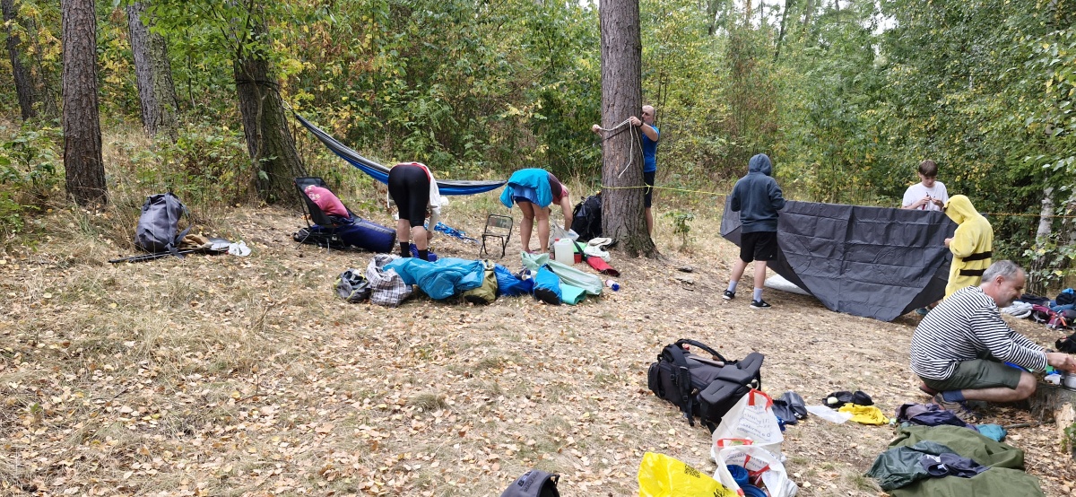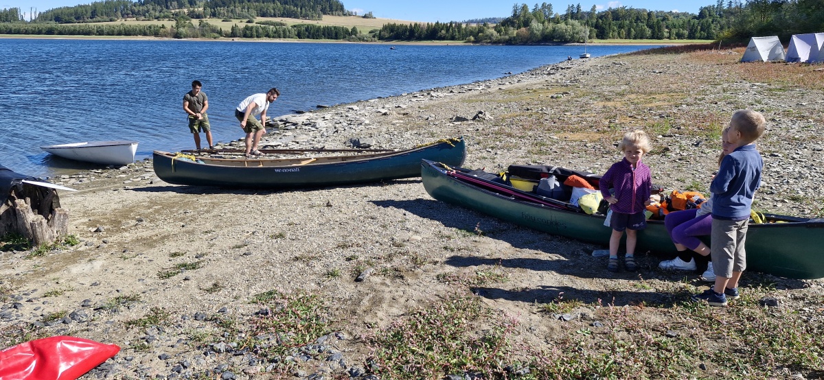 Protože tábořiště vodních skautů, od něhož jsme vyplouvali je už prázdné, využíváme toho a budeme letos spát na relativní rovince (tedy spíš mírném svahu) nad ním. Nemusíme přesouvat na noc lodě a máme to i blíž a autům, kdyby to byla potřeba.