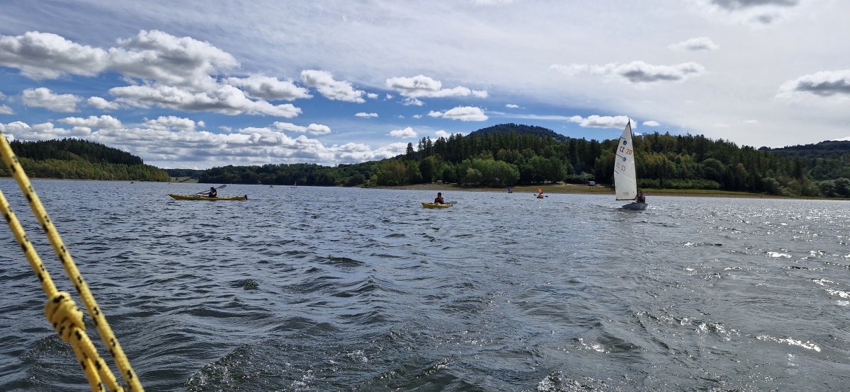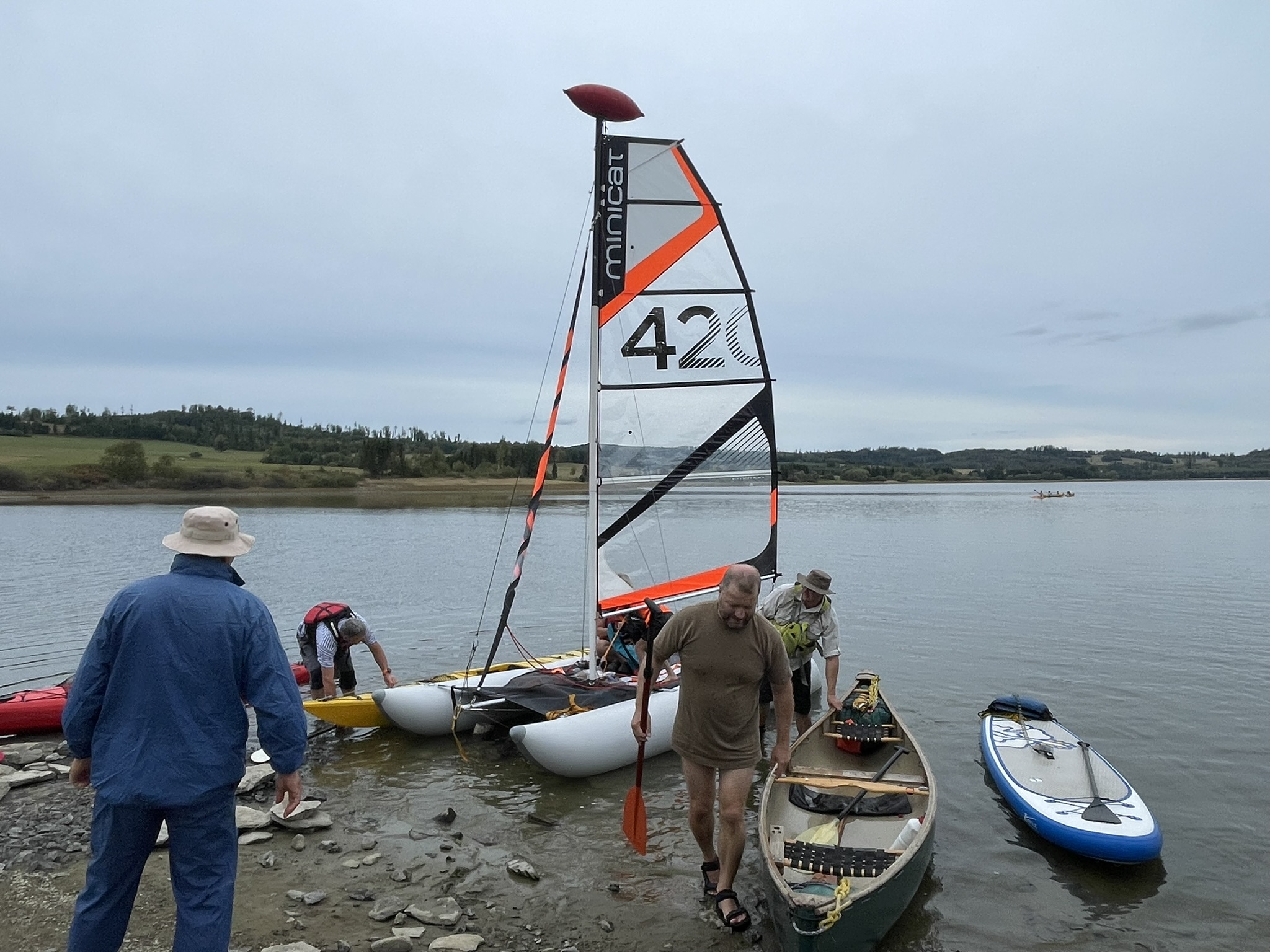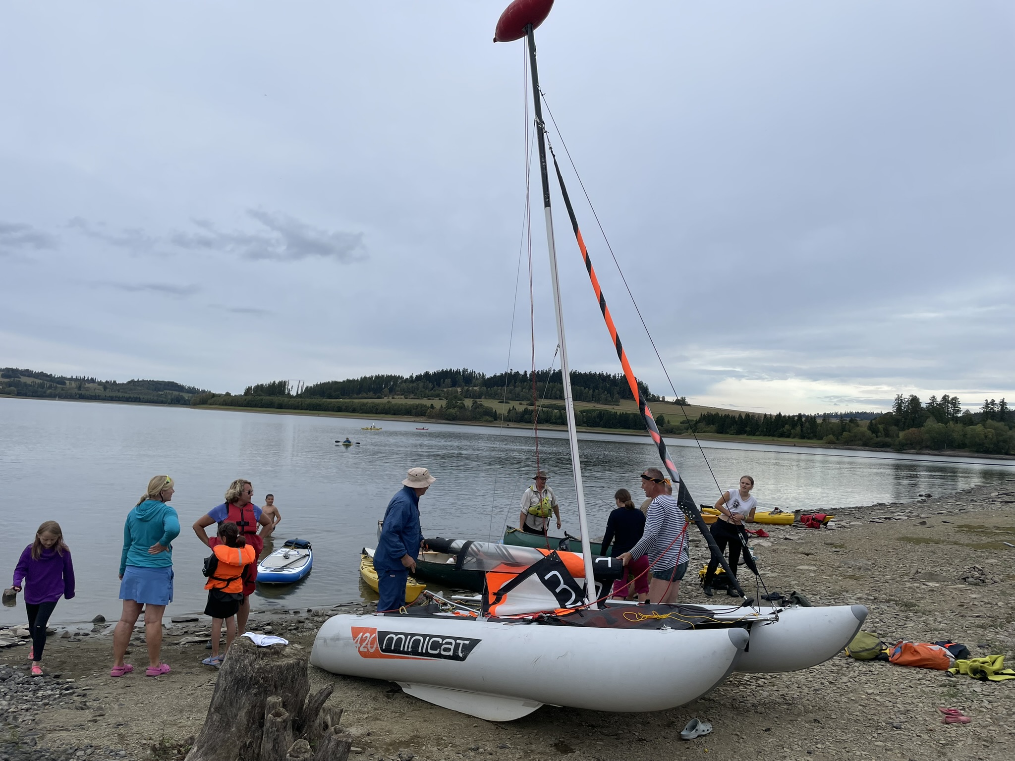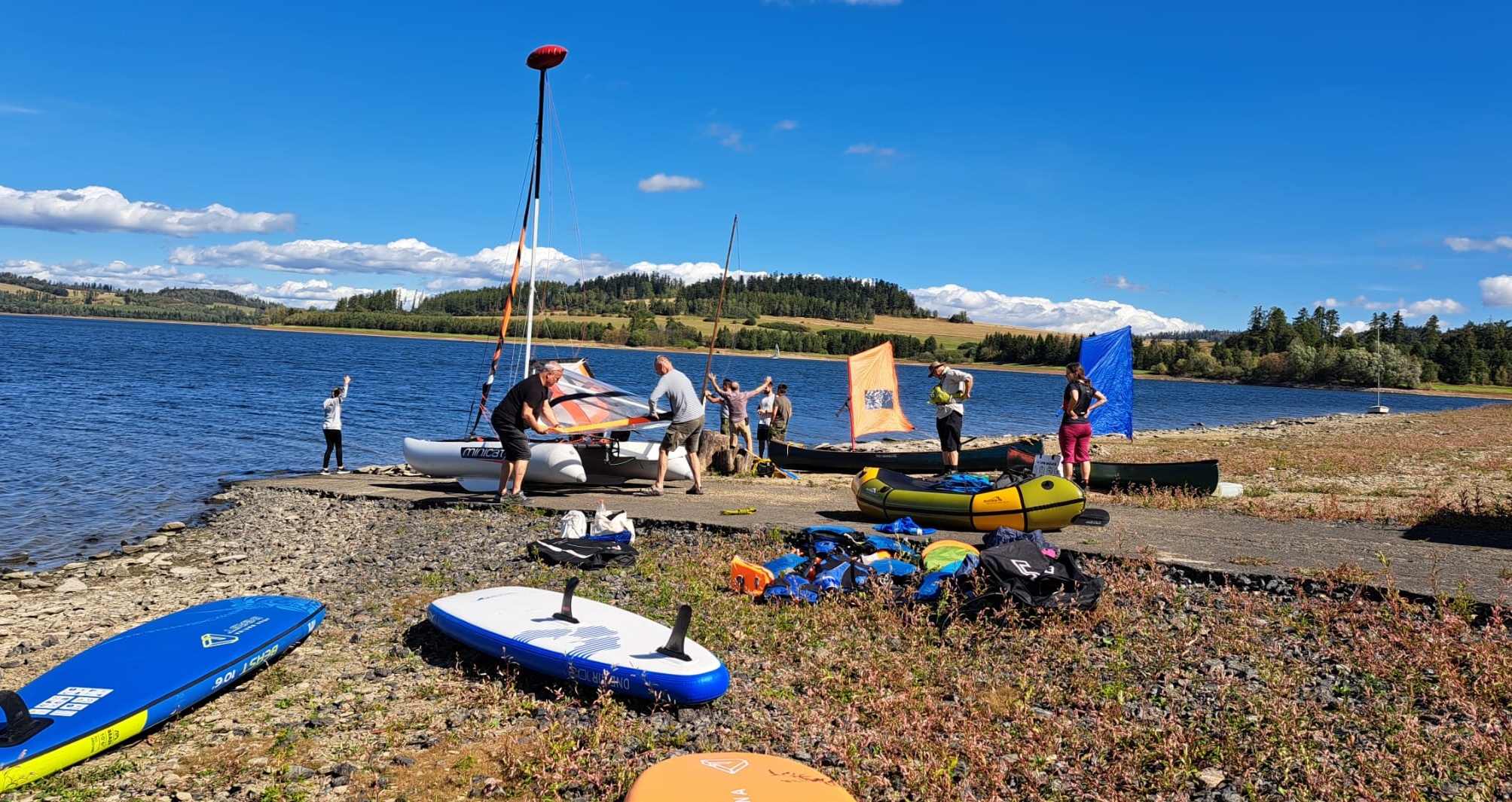 Na přehradu sobotní dopoledne přijíždí Pípa s Uhlíkem, Martinem a jeho přítelkyní a plachetnicí třídy EVROPA. Já s Kájou, Myšákem a Nikem s nafukovacím katamaranem MINICAT 420 + třemi oddílovými paddleboardy (jeden je oplachtěný) + zapůjčeným packraftem. Ve svém voze přijíždí Pajtáš (veliký dík za dovoz i odvoz Myšáka a Nika). Doráží taky Liška s rodiči a jedním oddílovým paddleboardem. Z Brna přijíždí Pad s Kubou a Frantou. Fof, Babča, Edita, Zolo, Táňa a Lucinka přivážejí sedm mořských kajaků. Owai, Pecka, Katie, Rosa, Fabien a Lulu mají dvě oplachtěné kanoe. Jako poslední přijíždí Murza bez dětí. Pokud jsem na nikoho nezapomněl, bylo nás minimálně 27 s docela slušnou flotilou (16) rozmanitých plavidel. Slabší kusy přijíždí sice jen na jeden den, ale i to je milé. Minimálně si mohou vyzkoušet plavidlo dle libosti. Třeba na packraftu se doposud nikdo ze sedmadvaceti přítomných neplavil : -)