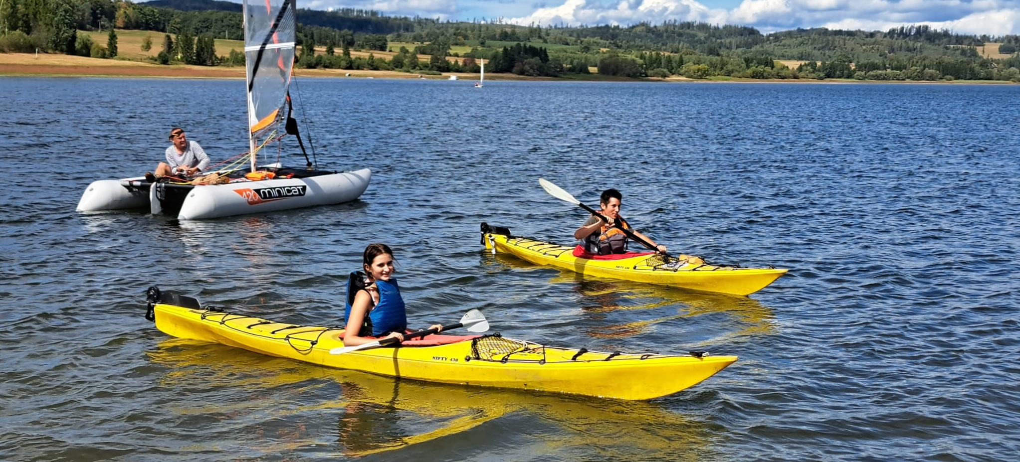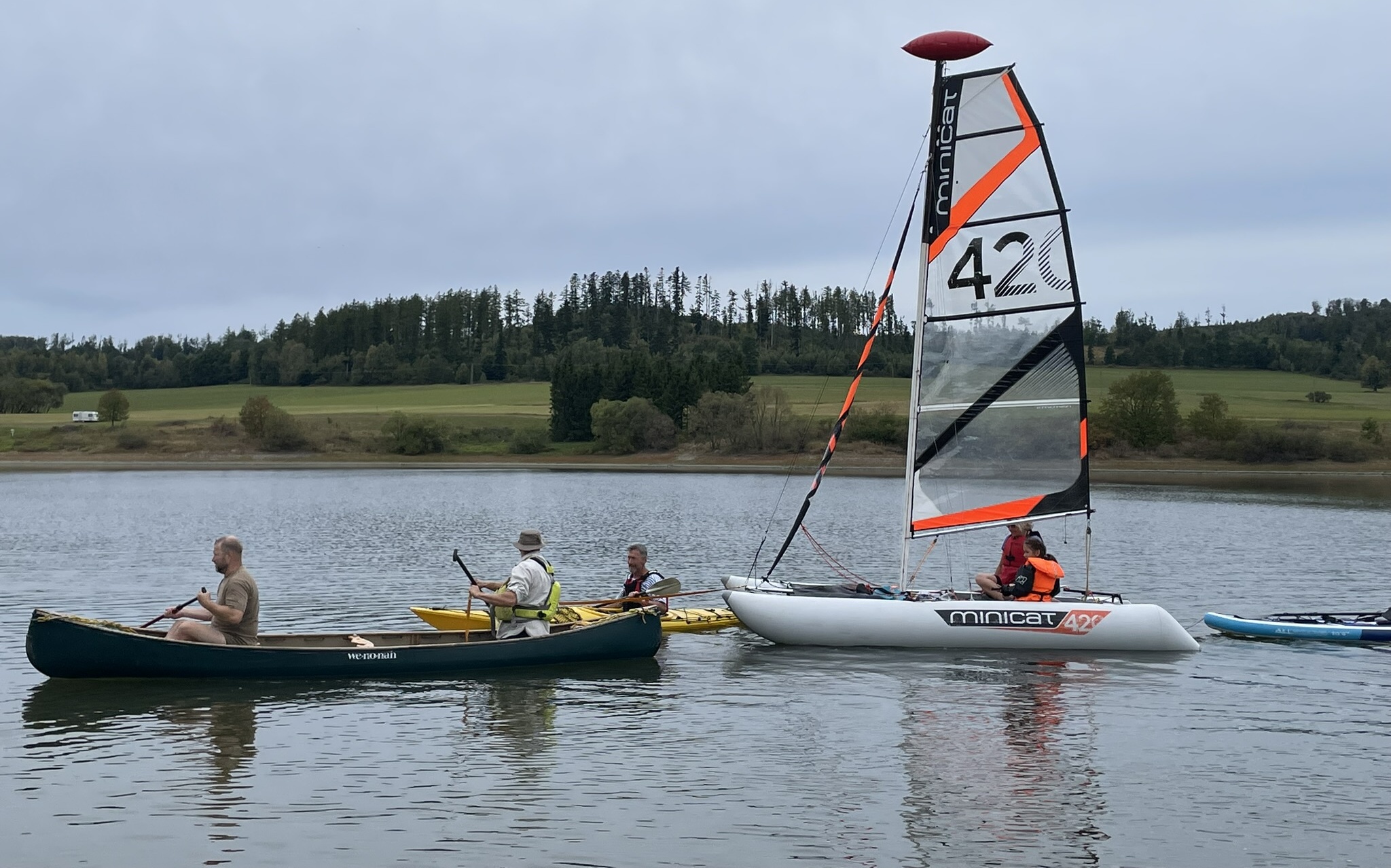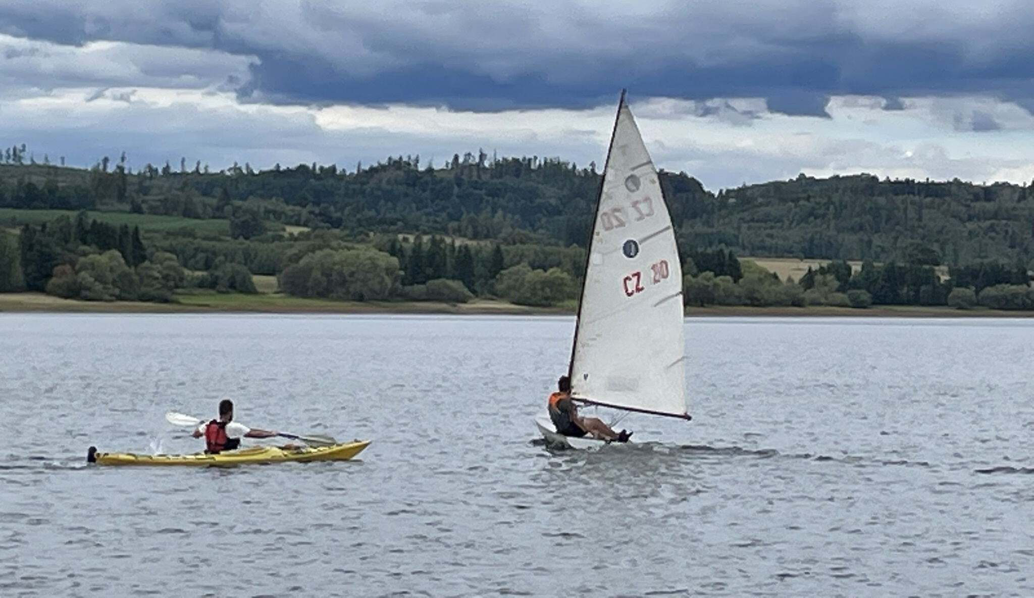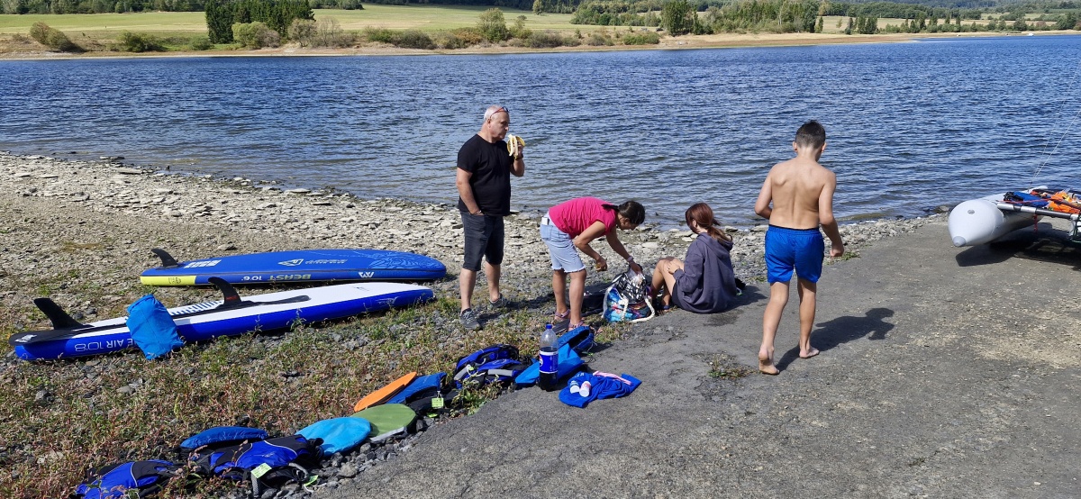 Na přehradu sobotní dopoledne přijíždí Pípa s Uhlíkem, Martinem a jeho přítelkyní a plachetnicí třídy EVROPA. Já s Kájou, Myšákem a Nikem s nafukovacím katamaranem MINICAT 420 + třemi oddílovými paddleboardy (jeden je oplachtěný) + zapůjčeným packraftem. Ve svém voze přijíždí Pajtáš (veliký dík za dovoz i odvoz Myšáka a Nika). Doráží taky Liška s rodiči a jedním oddílovým paddleboardem. Z Brna přijíždí Pad s Kubou a Frantou. Fof, Babča, Edita, Zolo, Táňa a Lucinka přivážejí sedm mořských kajaků. Owai, Pecka, Katie, Rosa, Fabien a Lulu mají dvě oplachtěné kanoe. Jako poslední přijíždí Murza bez dětí. Pokud jsem na nikoho nezapomněl, bylo nás minimálně 27 s docela slušnou flotilou (16) rozmanitých plavidel. Slabší kusy přijíždí sice jen na jeden den, ale i to je milé. Minimálně si mohou vyzkoušet plavidlo dle libosti. Třeba na packraftu se doposud nikdo ze sedmadvaceti přítomných neplavil : -)