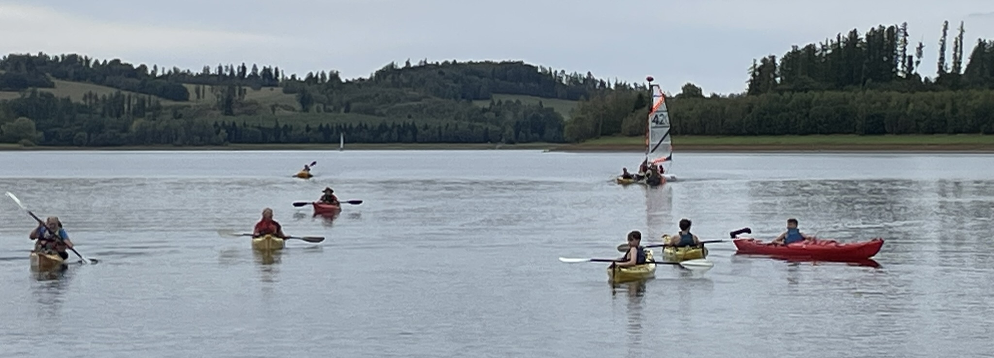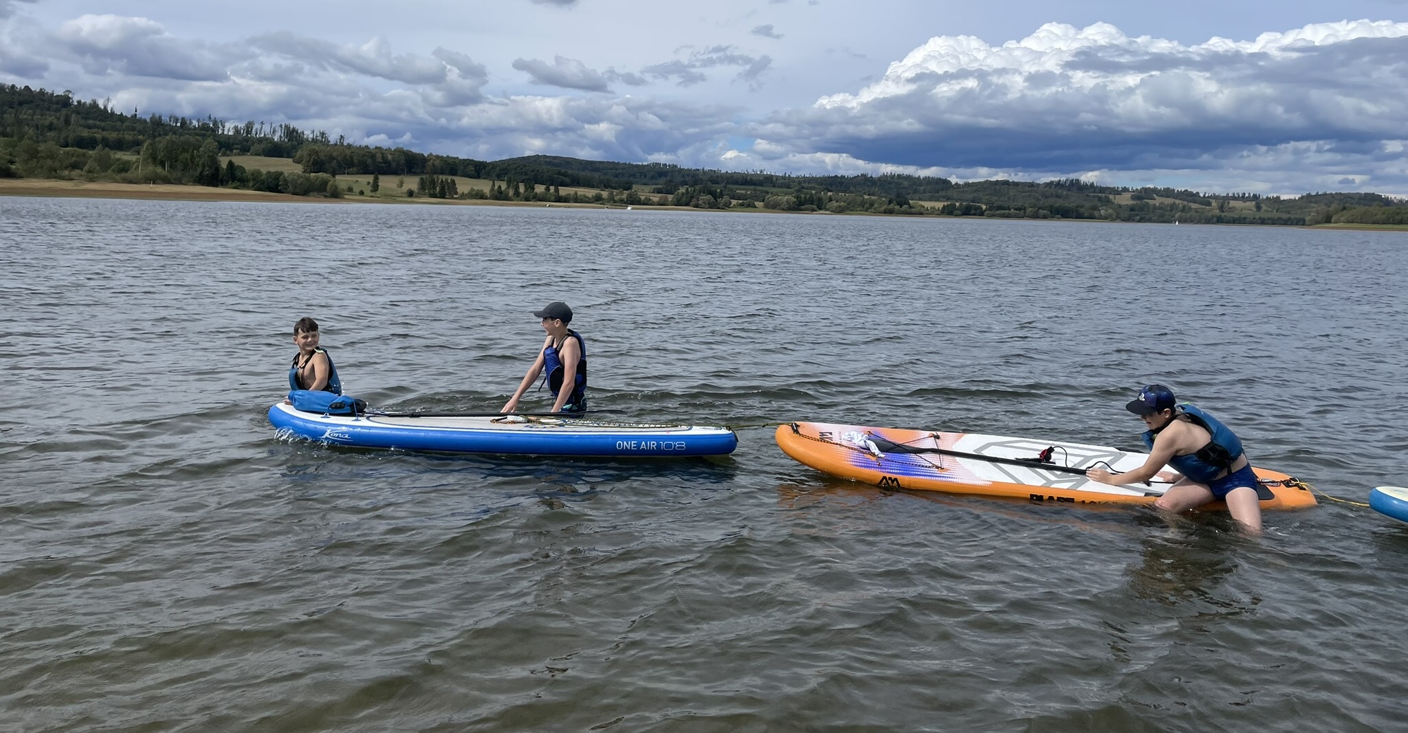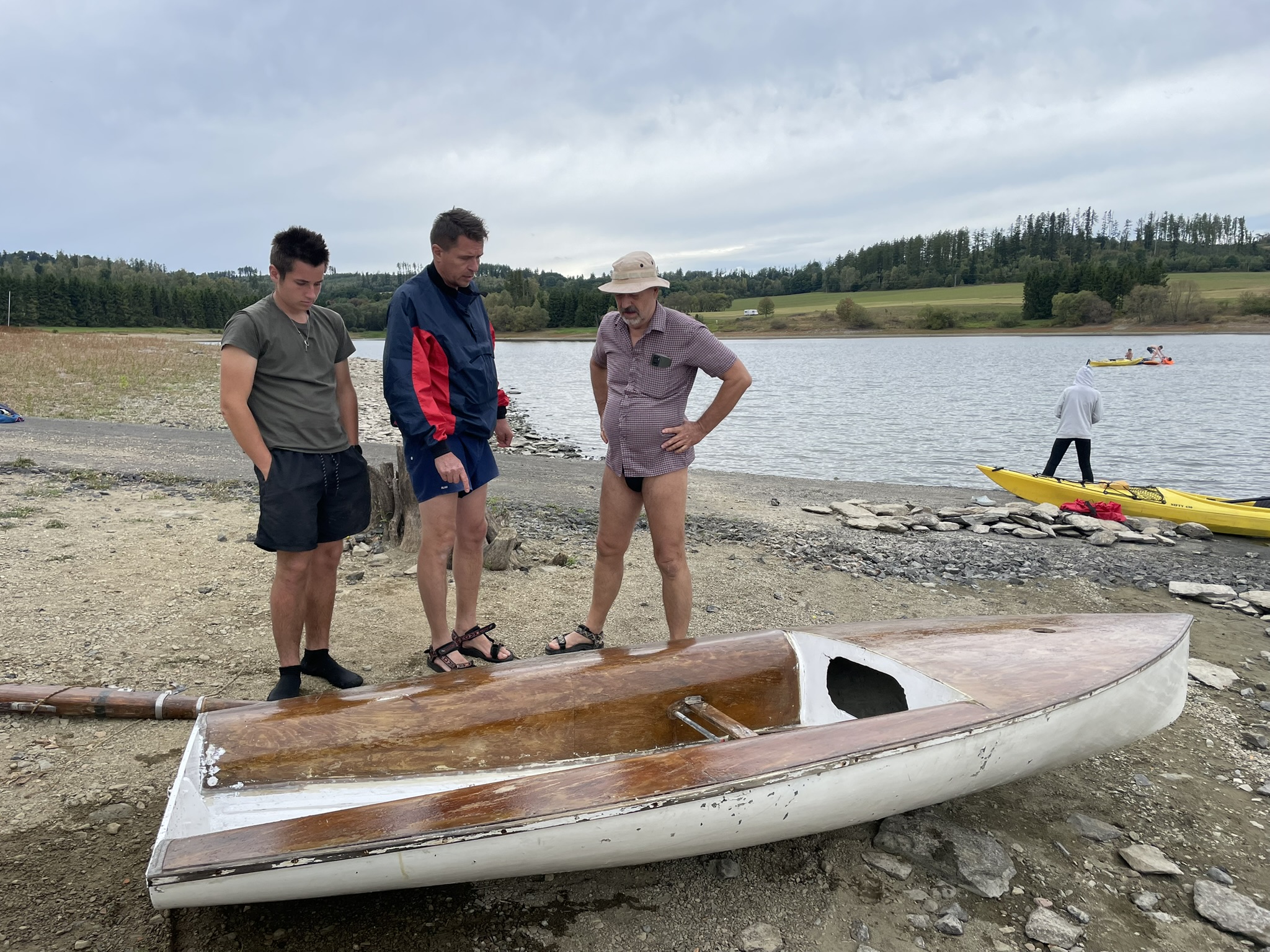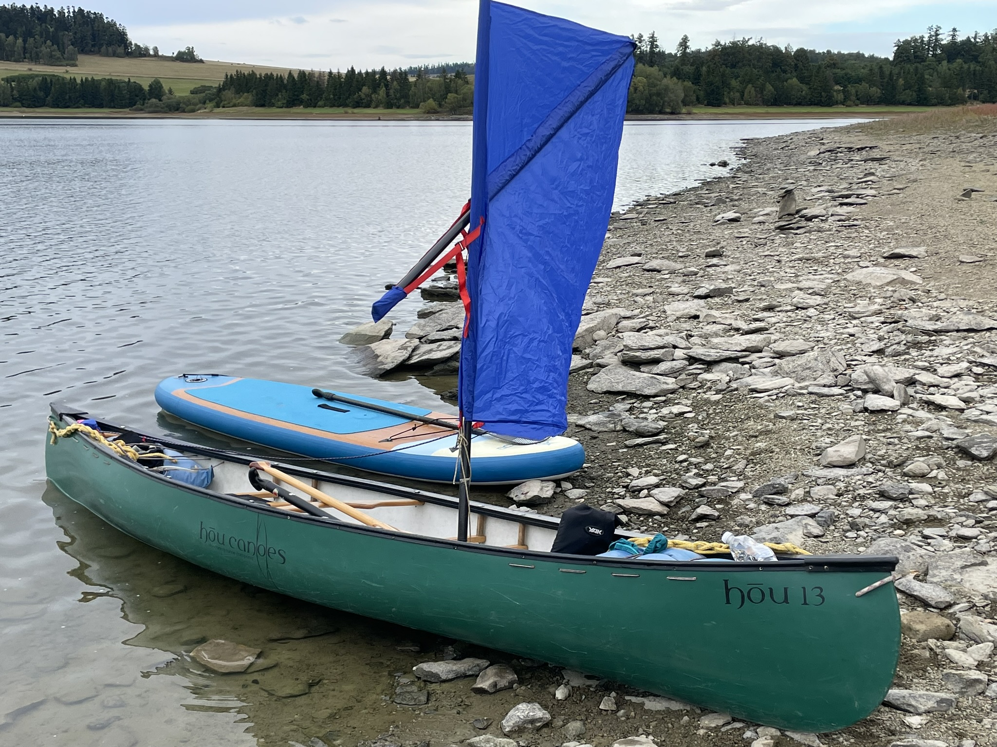 Na přehradu sobotní dopoledne přijíždí Pípa s Uhlíkem, Martinem a jeho přítelkyní a plachetnicí třídy EVROPA. Já s Kájou, Myšákem a Nikem s nafukovacím katamaranem MINICAT 420 + třemi oddílovými paddleboardy (jeden je oplachtěný) + zapůjčeným packraftem. Ve svém voze přijíždí Pajtáš (veliký dík za dovoz i odvoz Myšáka a Nika). Doráží taky Liška s rodiči a jedním oddílovým paddleboardem. Z Brna přijíždí Pad s Kubou a Frantou. Fof, Babča, Edita, Zolo, Táňa a Lucinka přivážejí sedm mořských kajaků. Owai, Pecka, Katie, Rosa, Fabien a Lulu mají dvě oplachtěné kanoe. Jako poslední přijíždí Murza bez dětí. Pokud jsem na nikoho nezapomněl, bylo nás minimálně 27 s docela slušnou flotilou (16) rozmanitých plavidel. Slabší kusy přijíždí sice jen na jeden den, ale i to je milé. Minimálně si mohou vyzkoušet plavidlo dle libosti. Třeba na packraftu se doposud nikdo ze sedmadvaceti přítomných neplavil : -)
