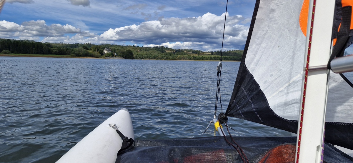 I když pořád ještě drobně prší, vyplouvám alespoň na katamaranu. Nefouká moc, ale krásně lze provádět „re“ i „halzu“. V jachtingu je „re“ obrat proti větru, kdy loď přetočí příď směrem proti větru a mění tak stranu plachtění z jedné strany na druhou přetažením přes větrný směr. Oproti tomu „halza“ je obrat po větru, kdy loď přetočí záď směrem do větru a ráhno během obratu rychle přelétává z jedné strany na druhou.