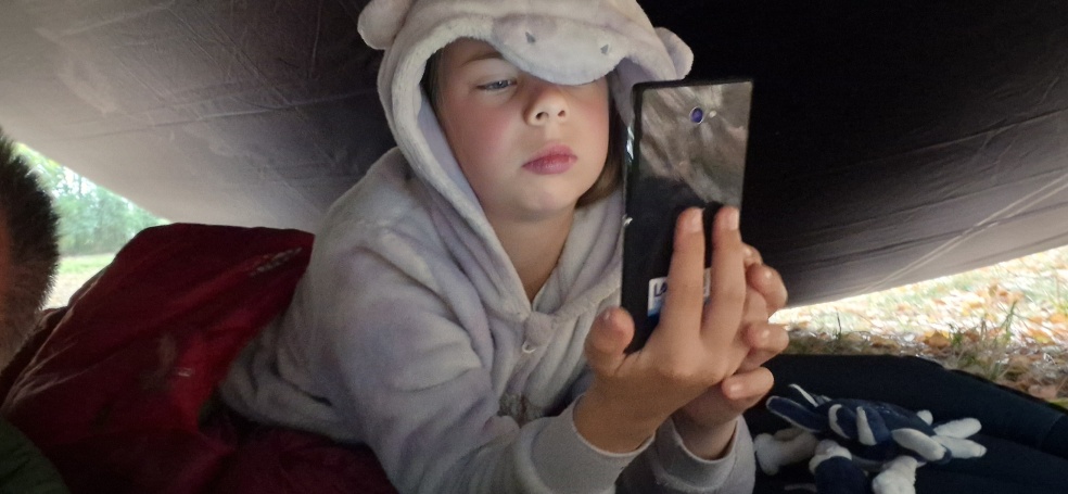 Když začínají padat první kapky, přináší Katie celtu, kterou nepoužili, ale mají ji s sebou (Owain i Pecka s sebou v dodávce vozí fakt vše co mne kdy napadlo), stavíme tedy vysoký přístřešek, kde si budeme moc všichni večer společně posedět.