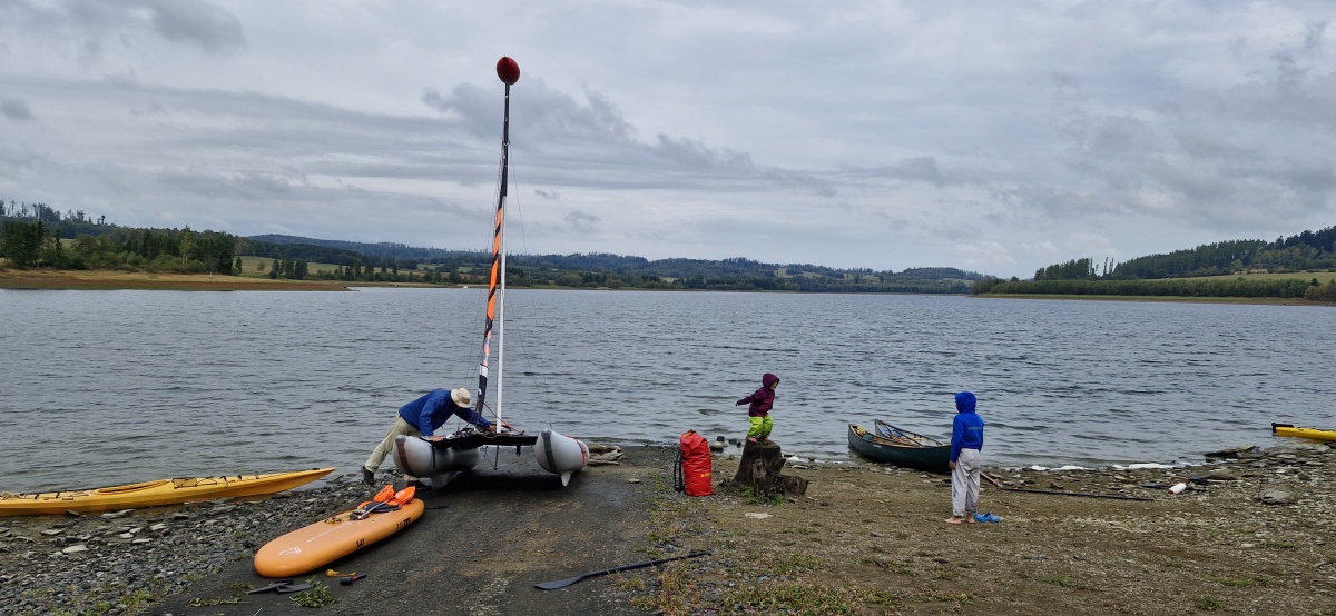 Když si vyzkouší plavbu na katamaranu i Pecka s Owainem, začínáme kolem poledne vytahovat lodě na souš. Nejnáročnější je odstrojit, rozložit a uložit katamaran takže začínám jím. Instruuji Myšáka, aby s ostatními vyfoukl a sbalil paddleboardy a packraft a sám se soustřeďuji jen na katamaran.