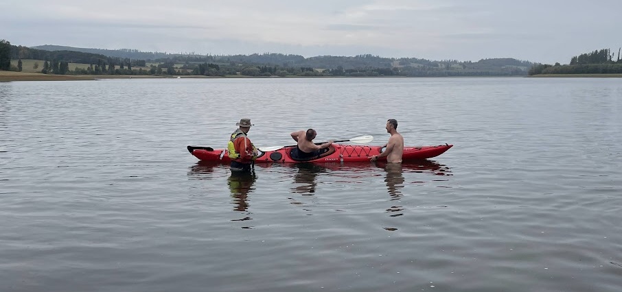 O plánovanou akci MOŘSKÝ KAJAK (příští rok) projevili zájem Uhlík a Liška, takže jsem moc rád, že si přijeli vyzkoušet jak, se takové plavidlo ovládá. I když to je samozřejmě jiné na klidné hladině přehrady a jiné na moři při metrových vlnách : -)