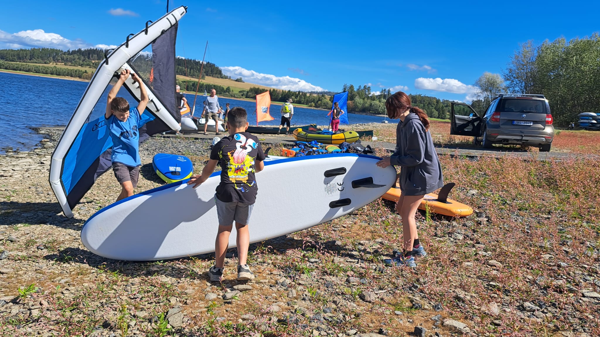 Čím člověk přiveze více odlišných plavidel, tím větší práce jej čeká. Zvláště pokud jsou všechny nafukovací : -) Ale zase mám novou zkušenost: do Škoda Yeti se mi skutečně vleze složený MINICAT 420, tři paddleboardy a jedna plachta k nim + packraft. K tomu čtyři plné lodní pytle a kytara. Ve finále se Kája jako spolujezdec nemusí vůbec tísnit : -)
