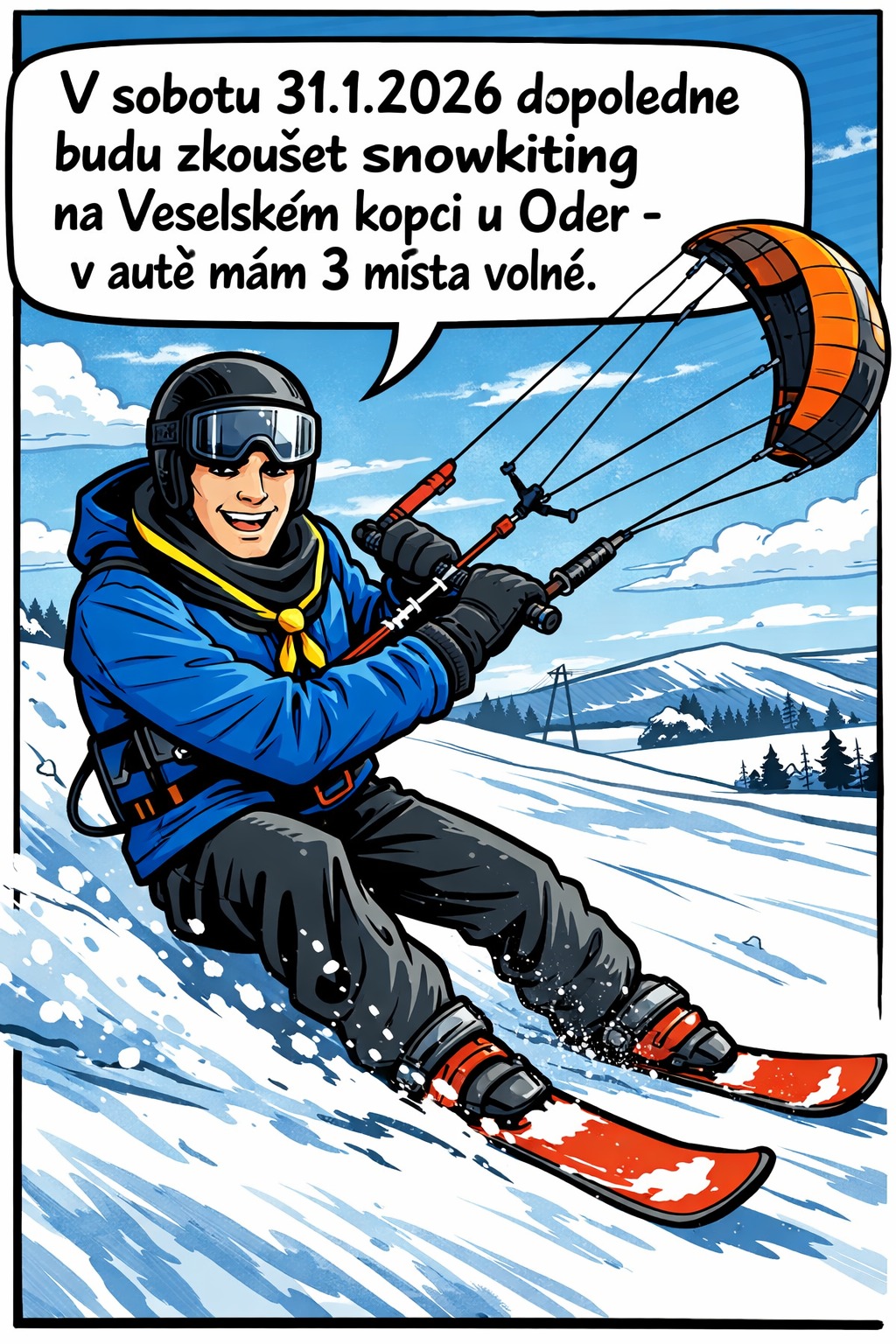 Míříme na Veselský kopec u Oder (557 m n. m.), který je vyhledávaný snowkiting spot v Oderských vrších. Ideální terén pro zimní kiting nejblíž od našeho domu, díky otevřenému terénu a dobrému větru. Je to jeden z největrnějších revírů v Česku, s častými podmínkami pro snowkiting i 5x týdně.