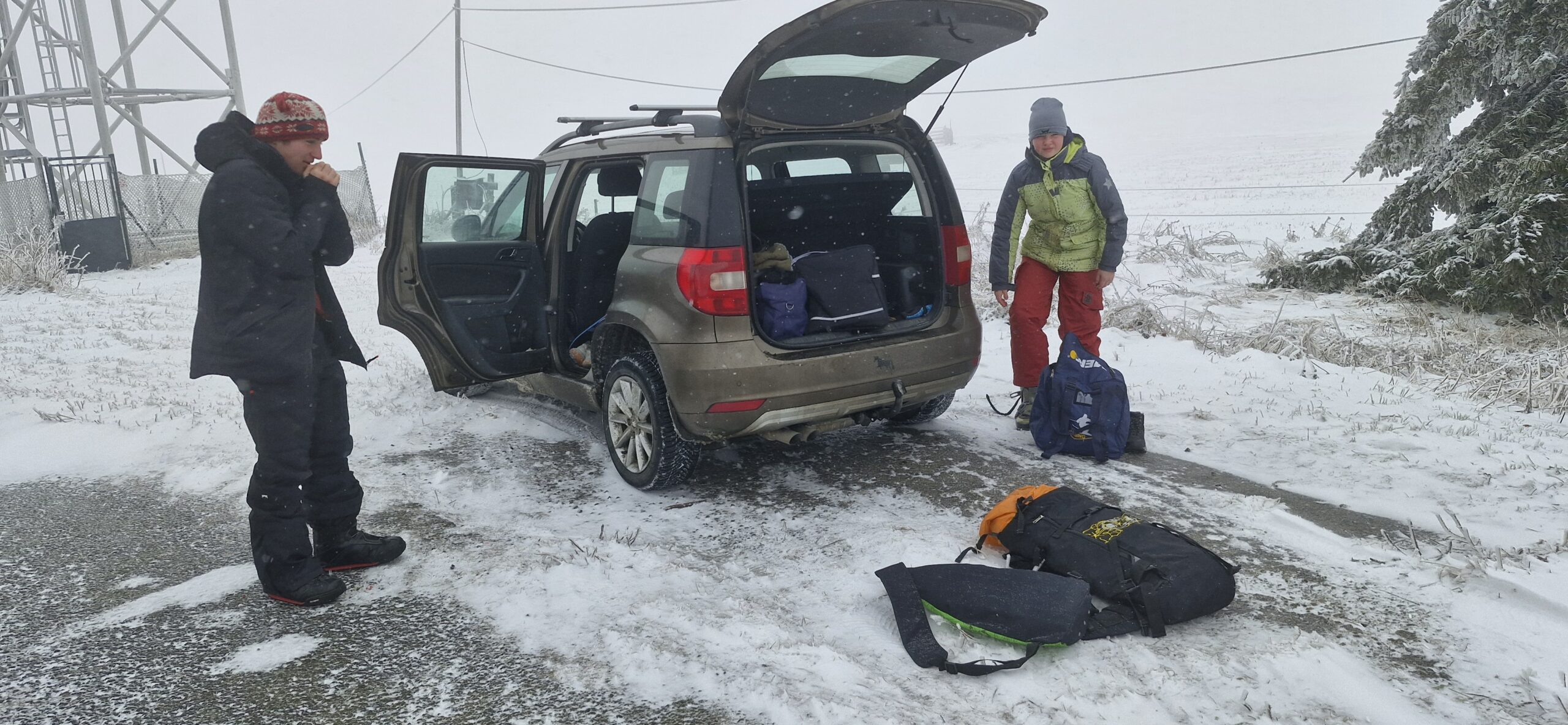Vyjíždím v sobotu po 8:00 od nás z domu, v autě jeden cvičný oddílový kite a dva moje normální kite, dvoje lyže, dvoje lyžáky, dvě termosky s čajem. Se mnou sedí v autě Kika, Myšákova starší sestra z Brna, která tam vede dívčí družinu Koalek. Jedeme k Uhlíkovi, který nakládá do auta svůj snowboard, lyžáky, bágl nacpaný technikou na filmování a sebe.