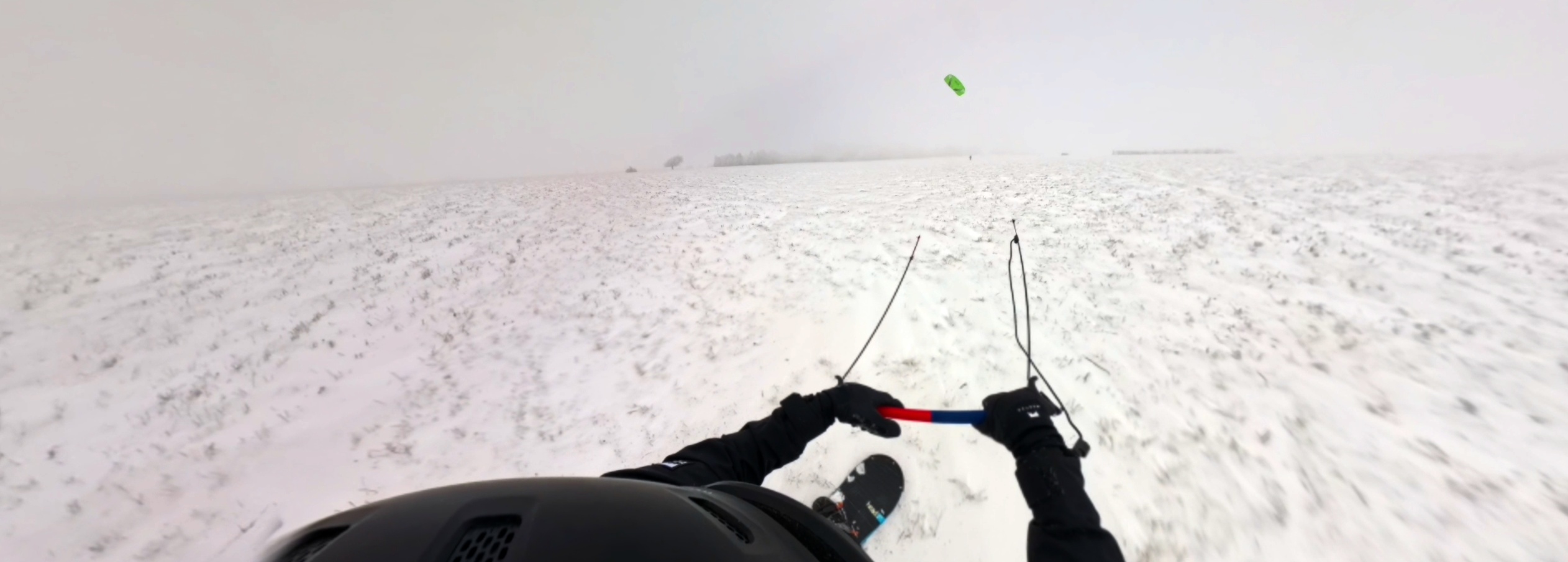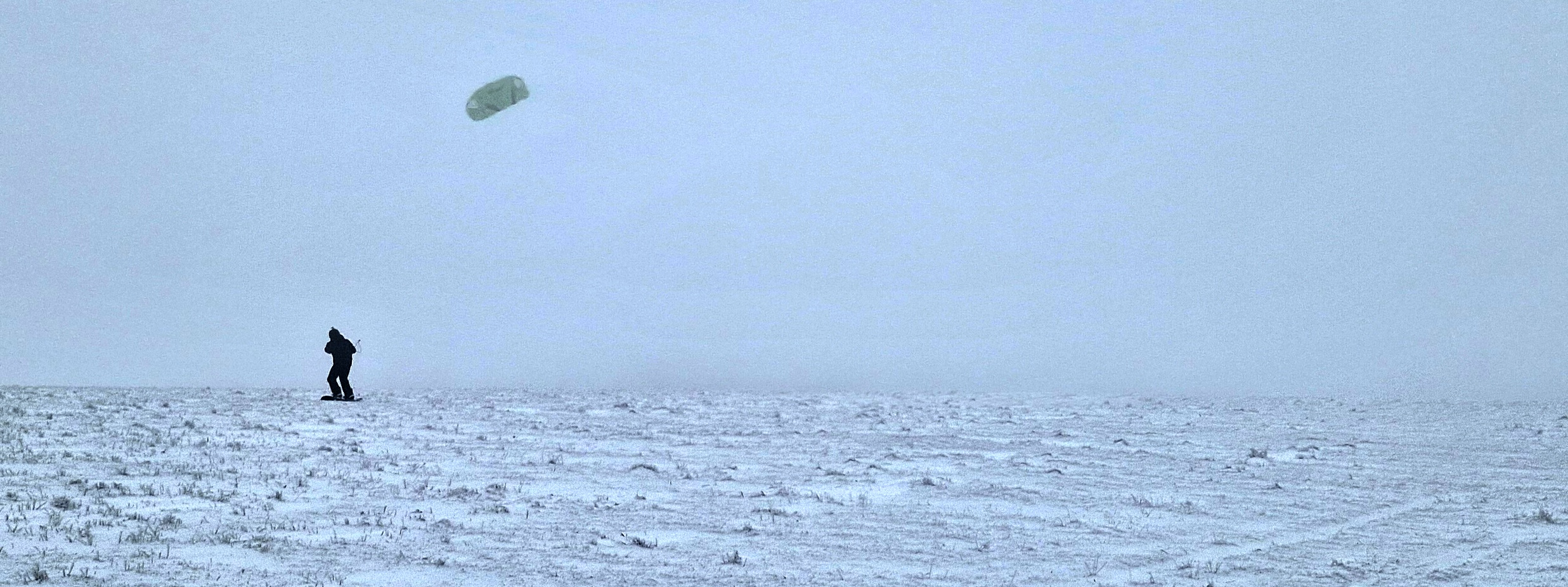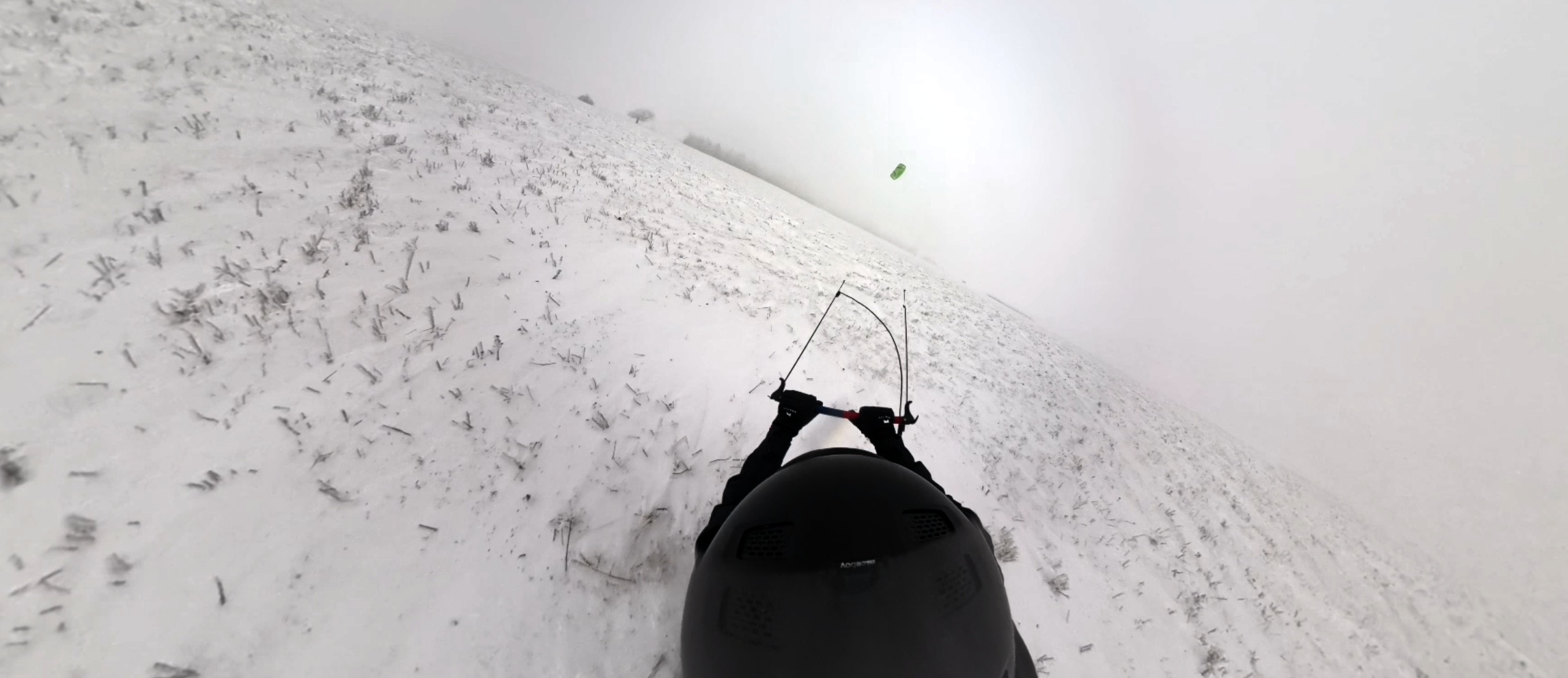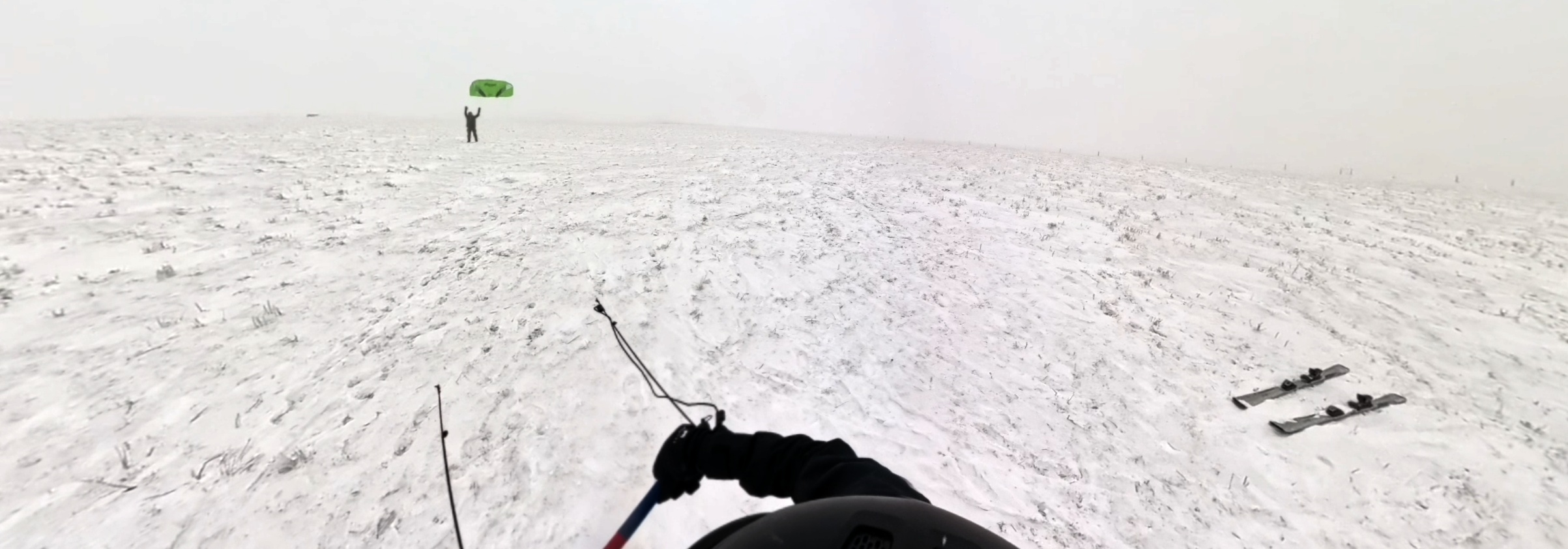 Předávám kite Uhlovi, který si jej zkouší nejdříve bez svého snowboardu. Na můj vkus mu to jde podezřele dobře. Říkám si sám pro sebe, že „první vyhrání z kapsy vyhání“, ale poté, co si nasadí prkno a Kika mu nahodí vrchlík kite, ten holomek se normálně rozjíždí a po chvíli mizí v mlze. Geny ani Uhlík nevyčurá : -)
