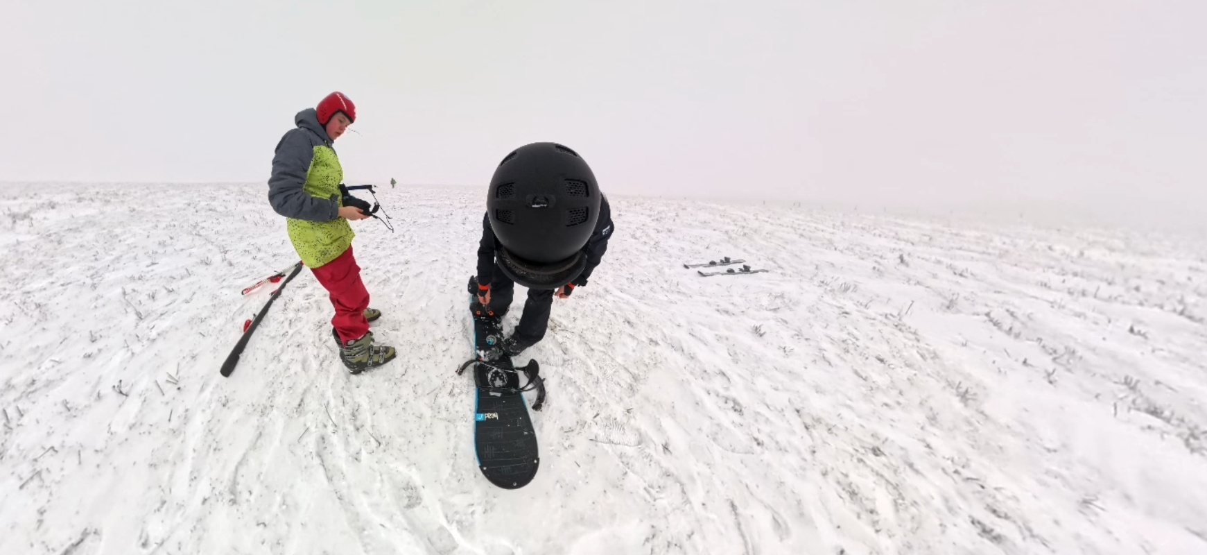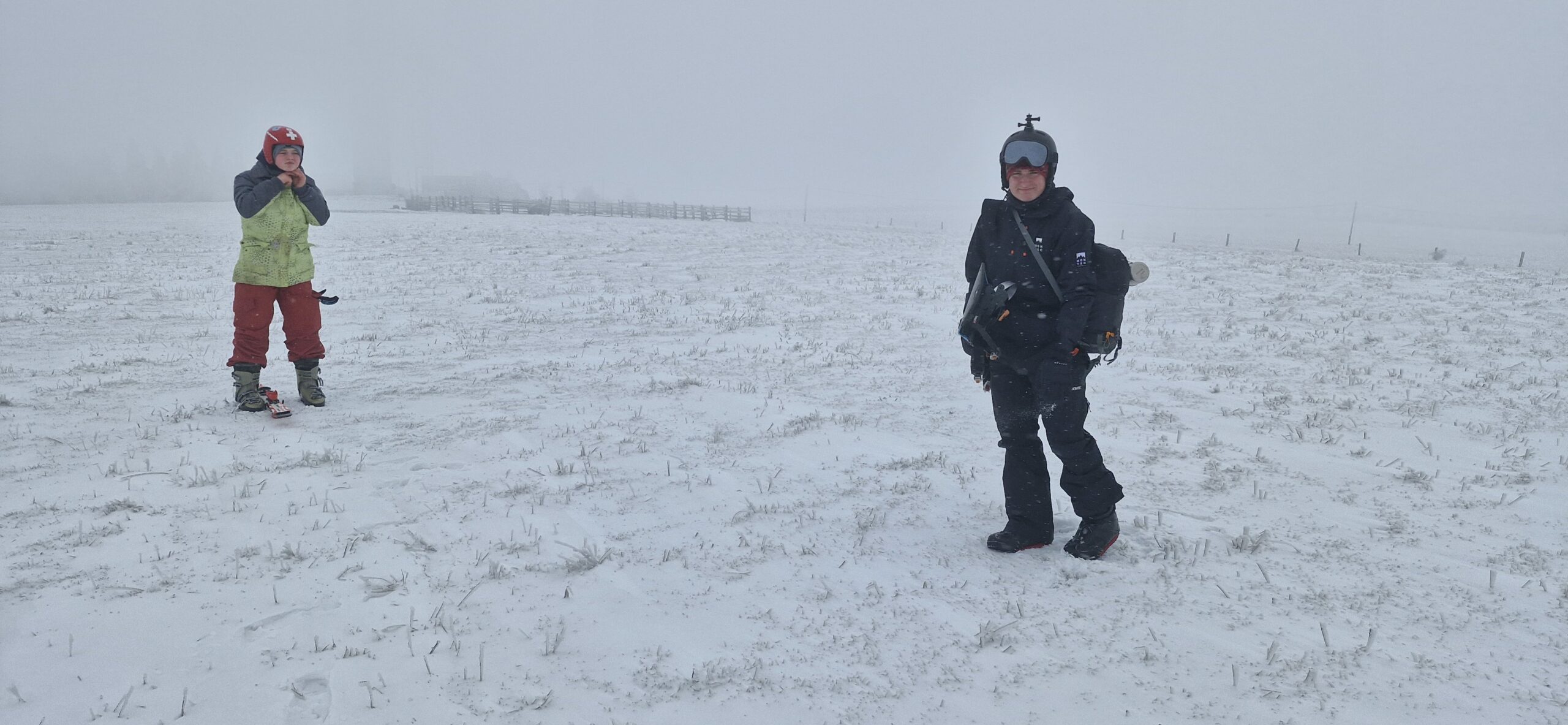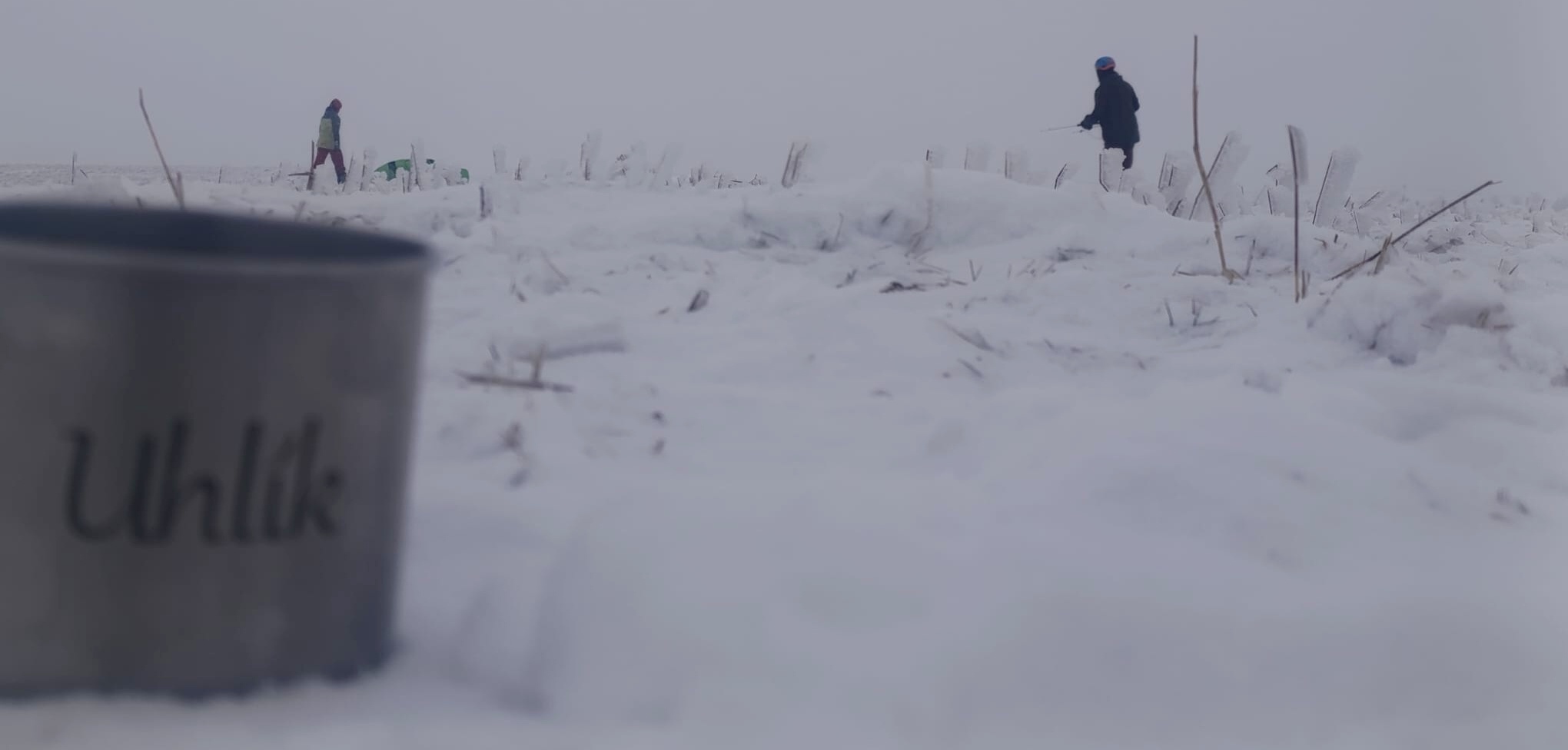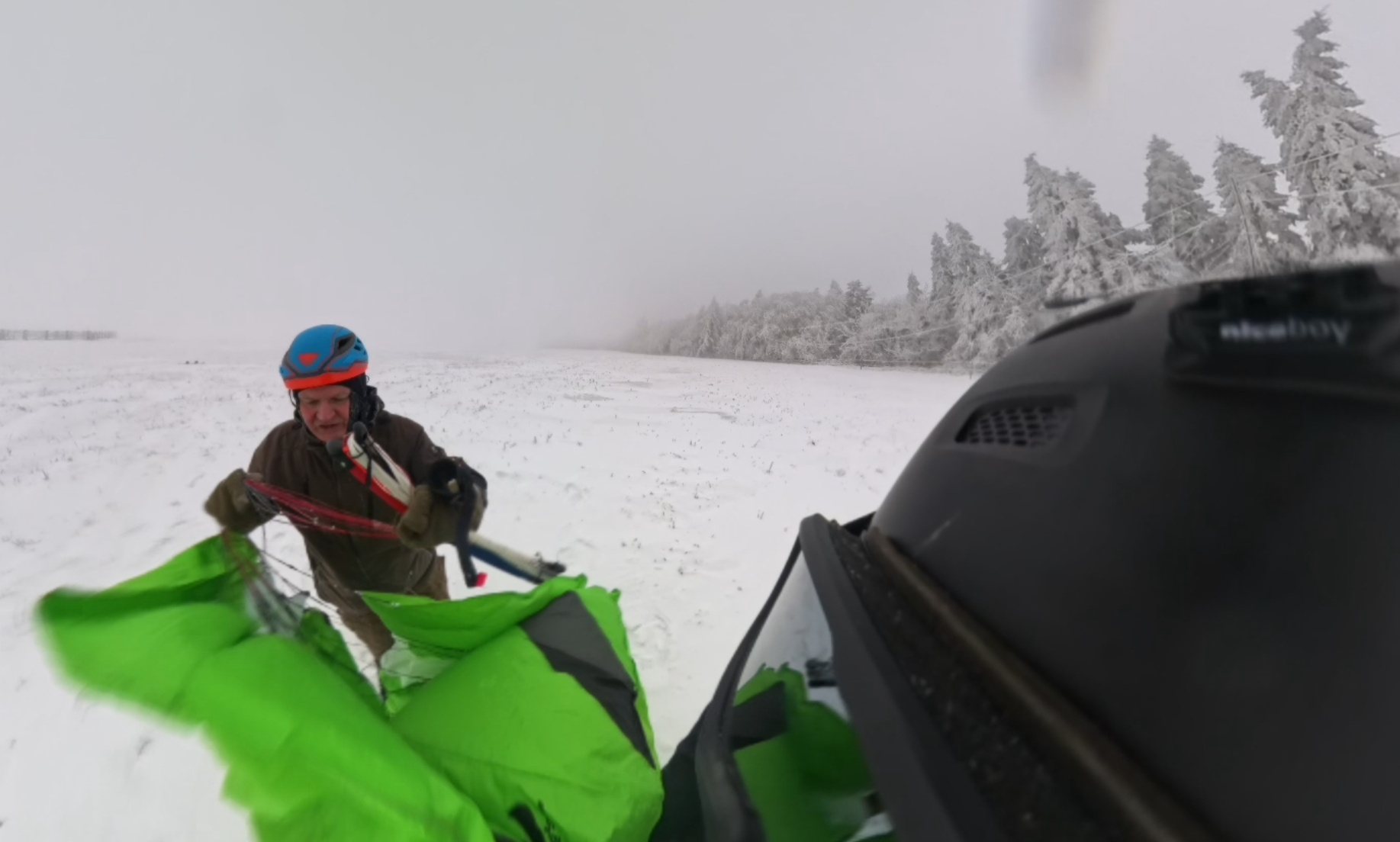 Předávám kite Uhlovi, který si jej zkouší nejdříve bez svého snowboardu. Na můj vkus mu to jde podezřele dobře. Říkám si sám pro sebe, že „první vyhrání z kapsy vyhání“, ale poté, co si nasadí prkno a Kika mu nahodí vrchlík kite, ten holomek se normálně rozjíždí a po chvíli mizí v mlze. Geny ani Uhlík nevyčurá : -)