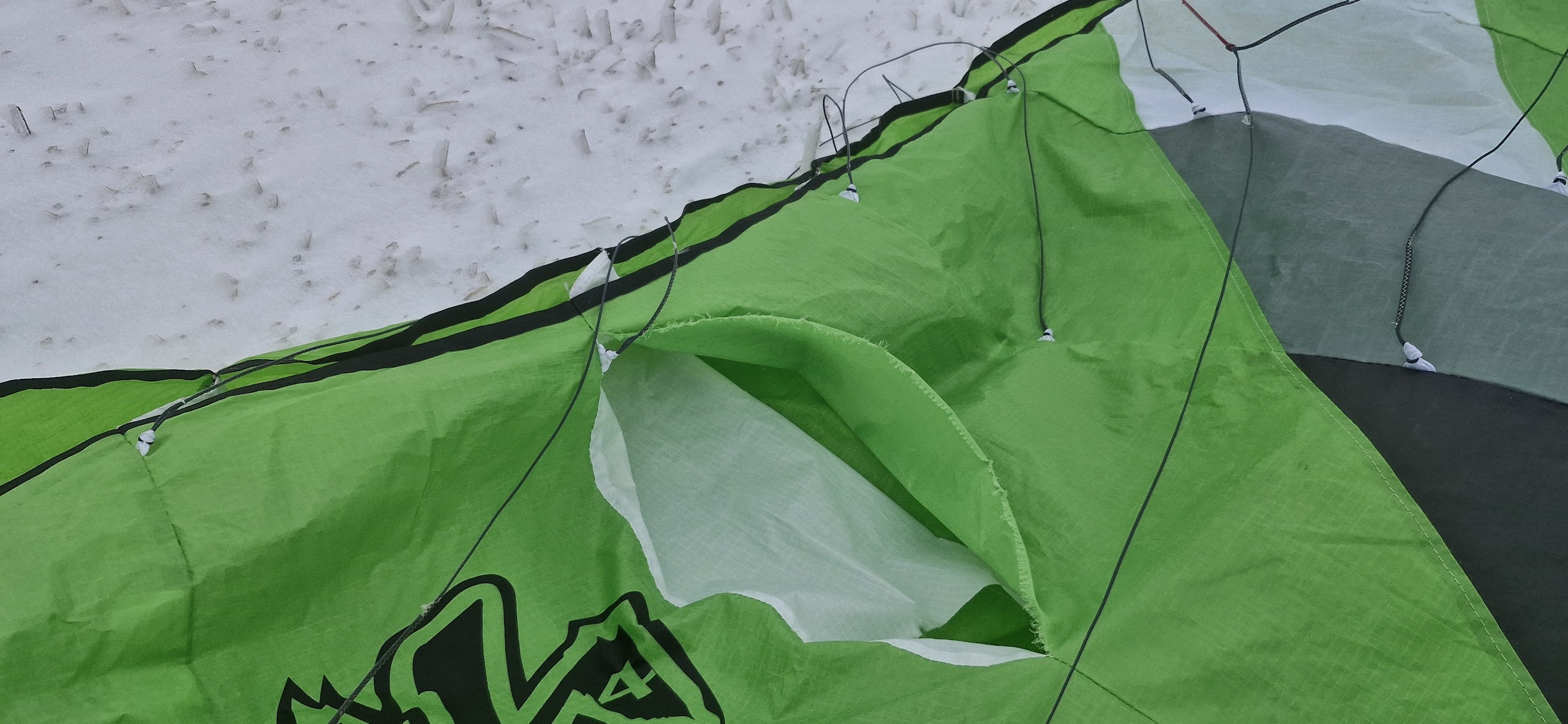 Když později nahazuji vrchlík Kristýně, všímám si, že je roztržený :- ( Dobrá nálada klesá na polovinu. Díra je ve švu spodní části vrchlíku, u náběhové hrany, má zatím 30-35 cm. Dneska dostává kite pořádný záhul, a tak nárazy na nedokonale zasněženou zmrzlou pláň přinášejí své hořké ovoce. Vzduch z jedné komory při letu uniká, což brání stálému udržení tvaru vrchlíku a stability kitu. Šňůry i hrazdička jsou ale v pořádku. Protože tenhle cvičný kite stál před cca 10-15 lety oddílovou kasu kolem 4000 Kč, budu jej muset opravit. Může dobře sloužit ještě dalších 10 let. Šití ale nepřipadá v úvahu, ubral bych z okrajů „díry“ roztřepeného ripstop nylonu. Ale měl bych mít doma kus samolepícího Skytexu, takže až vrchlík vyschne, zkusím roztržený šev zalepit.