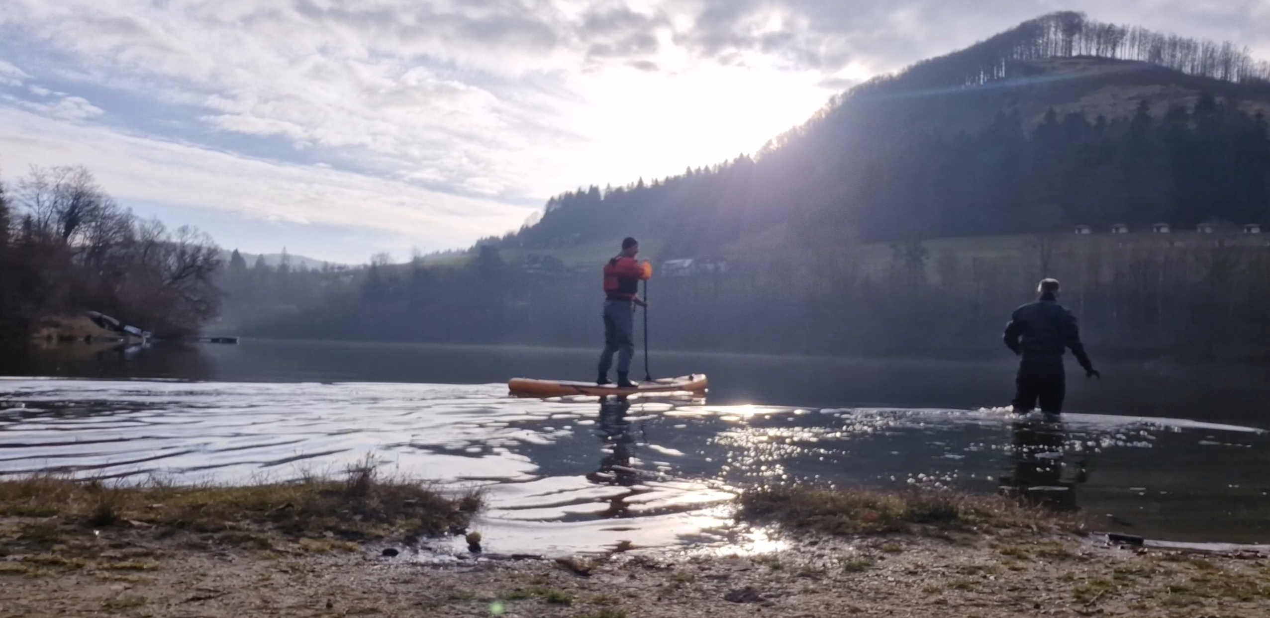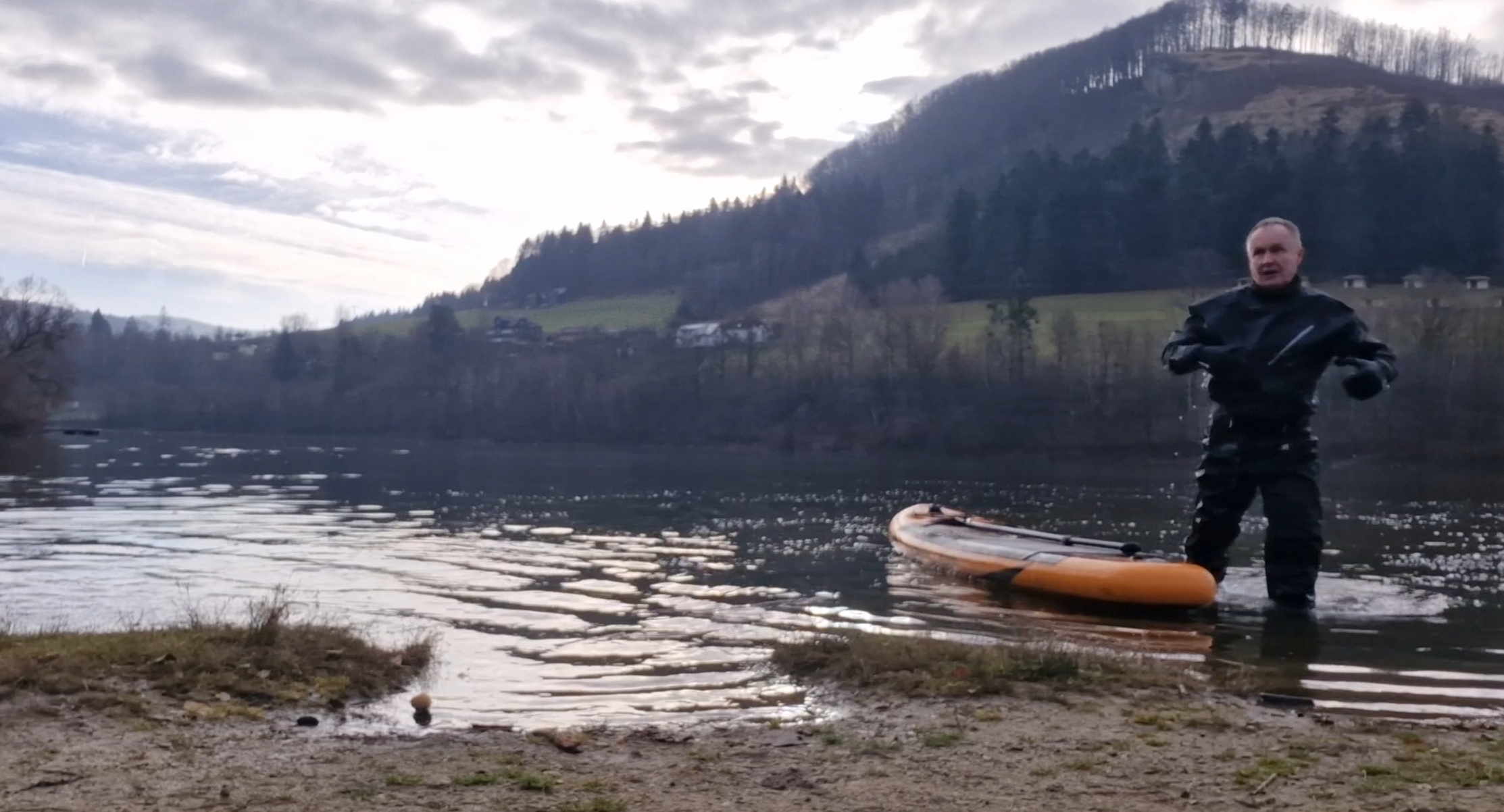 Zolo skáče z paddleboardu do vody a jeho první reakce je, že jeho suchý oblek těsní, že necítí žádnou vlhkost. Zatímco Zolo plave k druhému břehu, já plavu jen pro jeho paddleboard, který se volně houpá pár desítek metrů ode mne na hladině. Když si na prkno stoupnu, pádlování se mi nedaří tak elegantně jako Zolovi. Troufám si napsat, že se mi nedaří skoro vůbec, a tak se už po pár desítkách metrů nechtěně poroučím pod hladinu. Alespoň zkouším teplotu vody na holém ksichtě. Ještě že mám krátké vlasy, ty mi uschnou rychle : -)