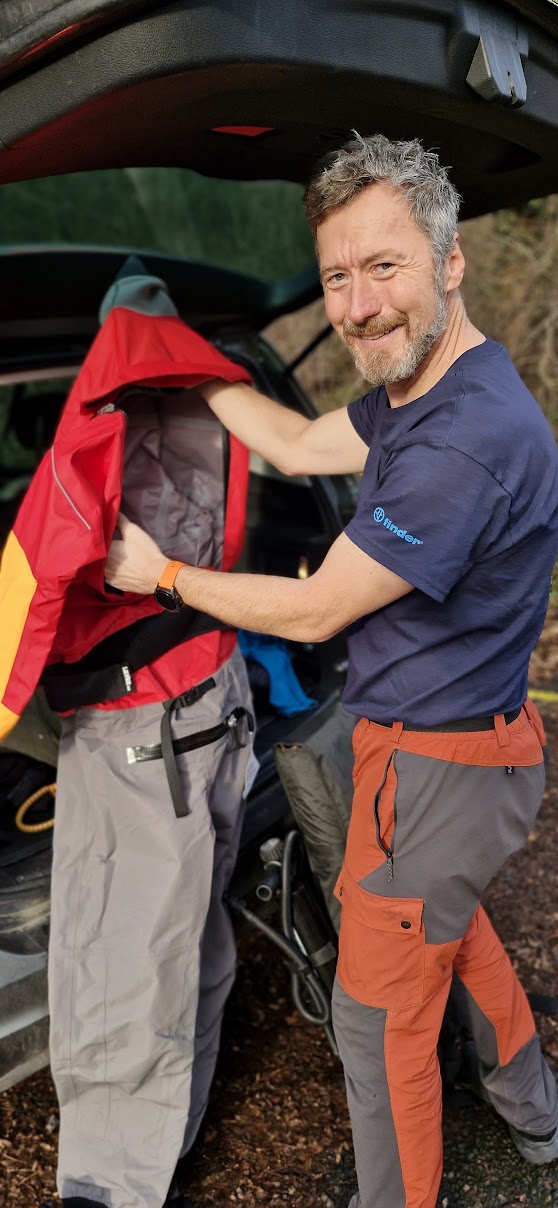 Zolo i já máme stejný typ suchého obleku, lišíme se jen barevným provedením. Já mám černý komplet a Zolo červeno-žluto-šedý, který bude v případné krizové situaci lépe a rychleji na vzduté hladině identifikovatelný.
