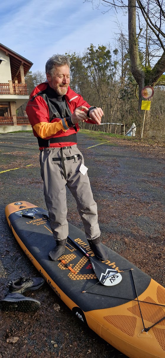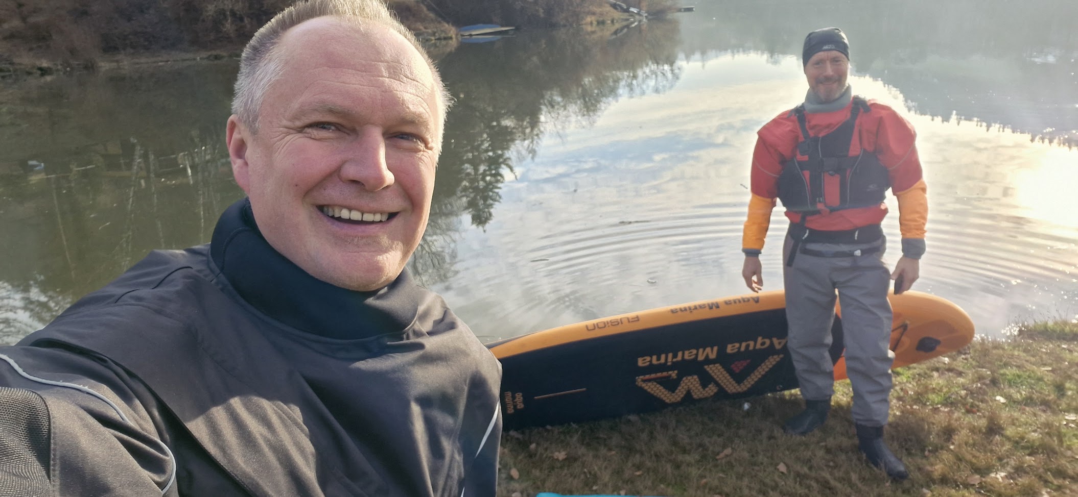 Postupně se nořím do vody hloub a hloub. Když jsem v ní po prsa, cítím na levé straně břicha větší chlad než na ostatních částech ponořeného těla. Okamžitě mi je jasné, že skrze pár milimetrovou nedotaženou škvírku zipu se dovnitř suchého obleku dere voda. Oznamuji tu nemilou zprávu Zolovi, ale ten tvrdí, že on je suchý. Aby ne, když pořád stojí a pádluje a paddleboardu a doposud ve vodě nesmočil ani podrážku.