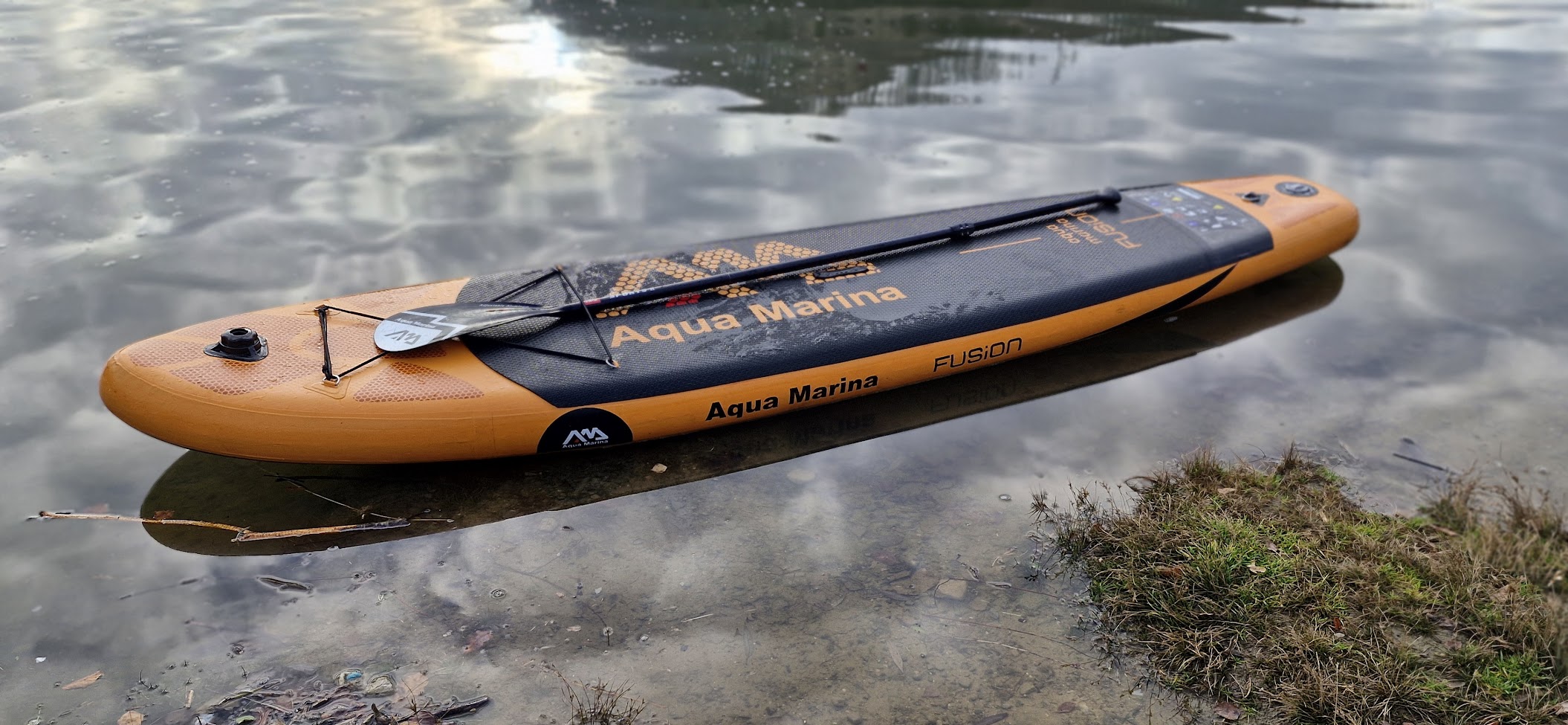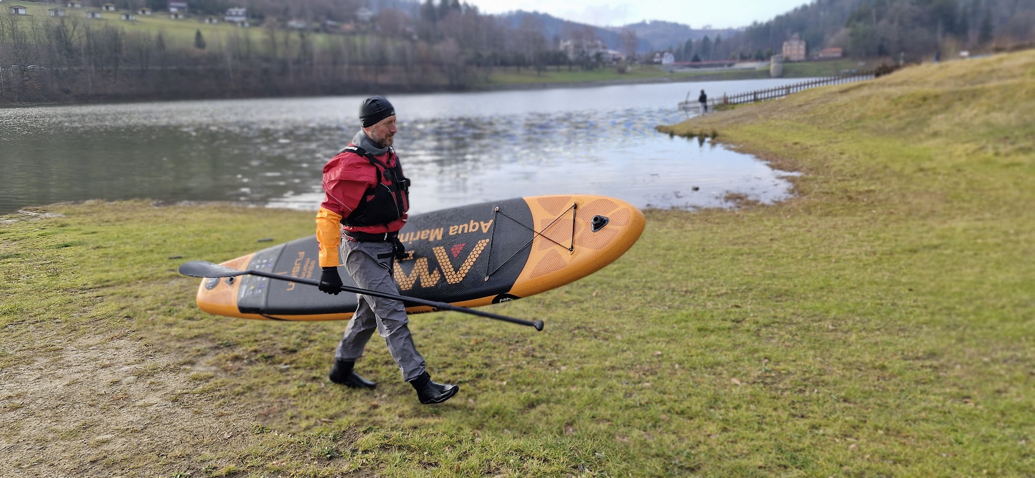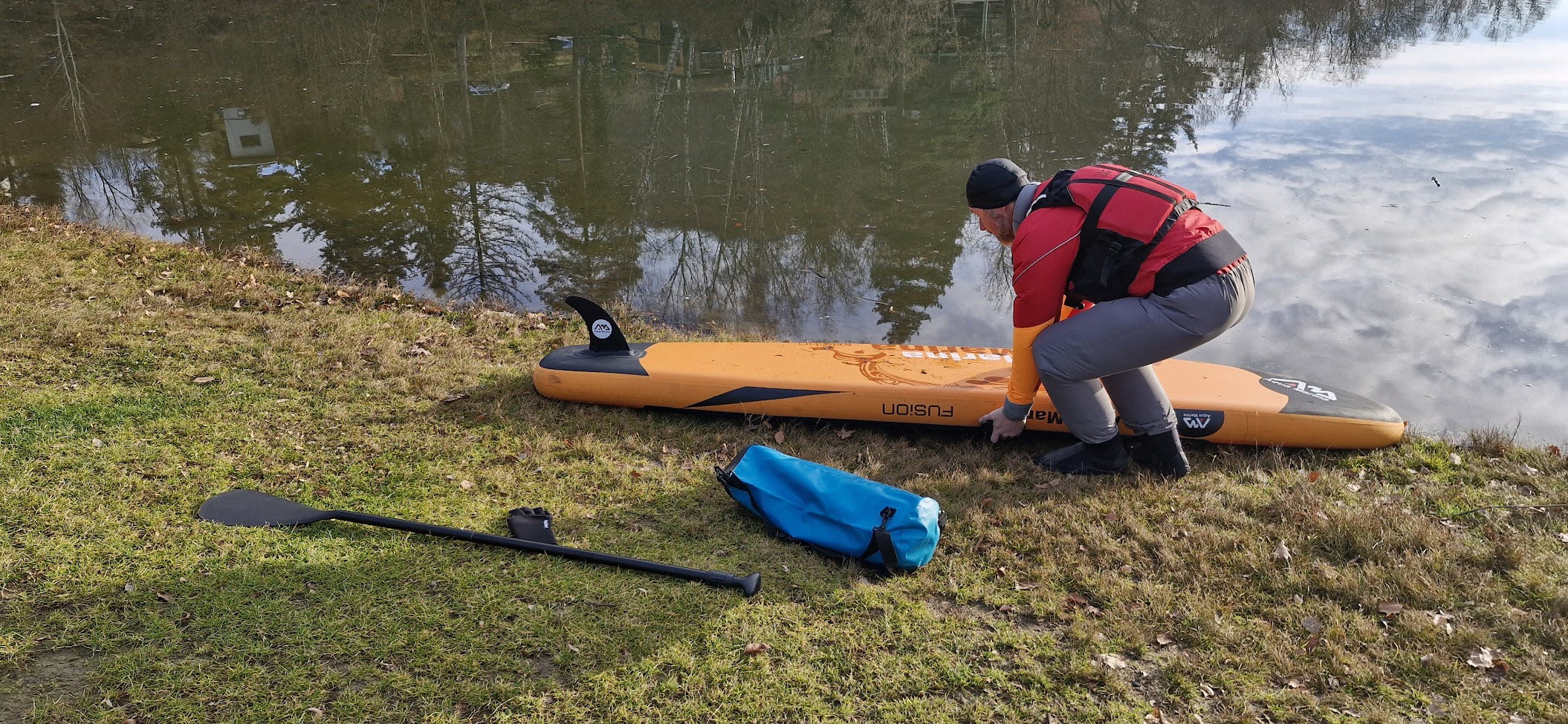Oblečeni se přesouváme od zaparkovaných aut asi 60 metrů k břehu vodní hladiny, na plážičku. Tady přidáváme na paddleboard ploutvičku.