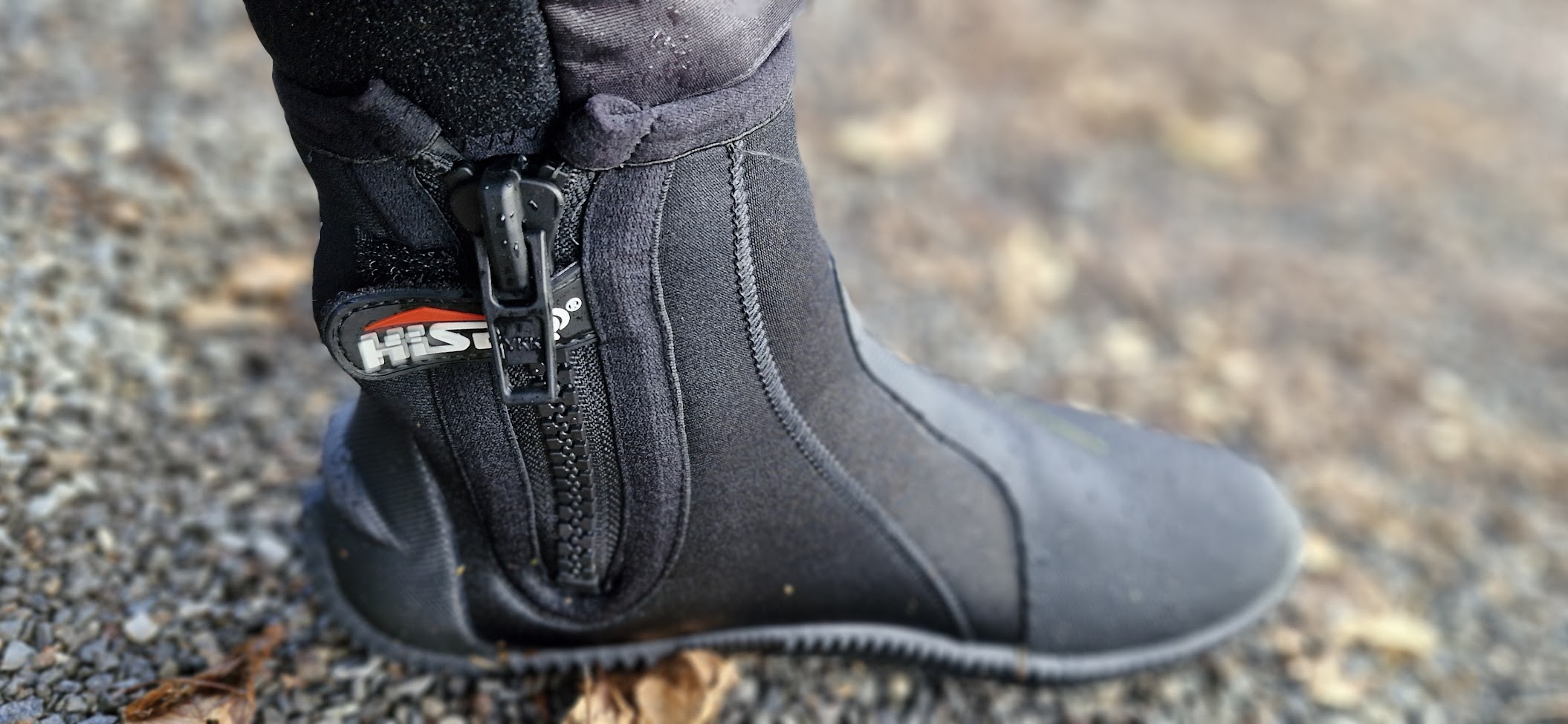 Nazouvám si lehčí (surfové) neoprenové boty, do kterých bez velkých obtíží dávám svoji tlapku s dvěma teplými ponožkami navlečenými pod suchým oblekem. Oblékám levou 5 mm tlustou neoprenovou rukavici a pravou ruku zatím nechávám volnou, abych mohl pohodlně fotit a točit mobilem.