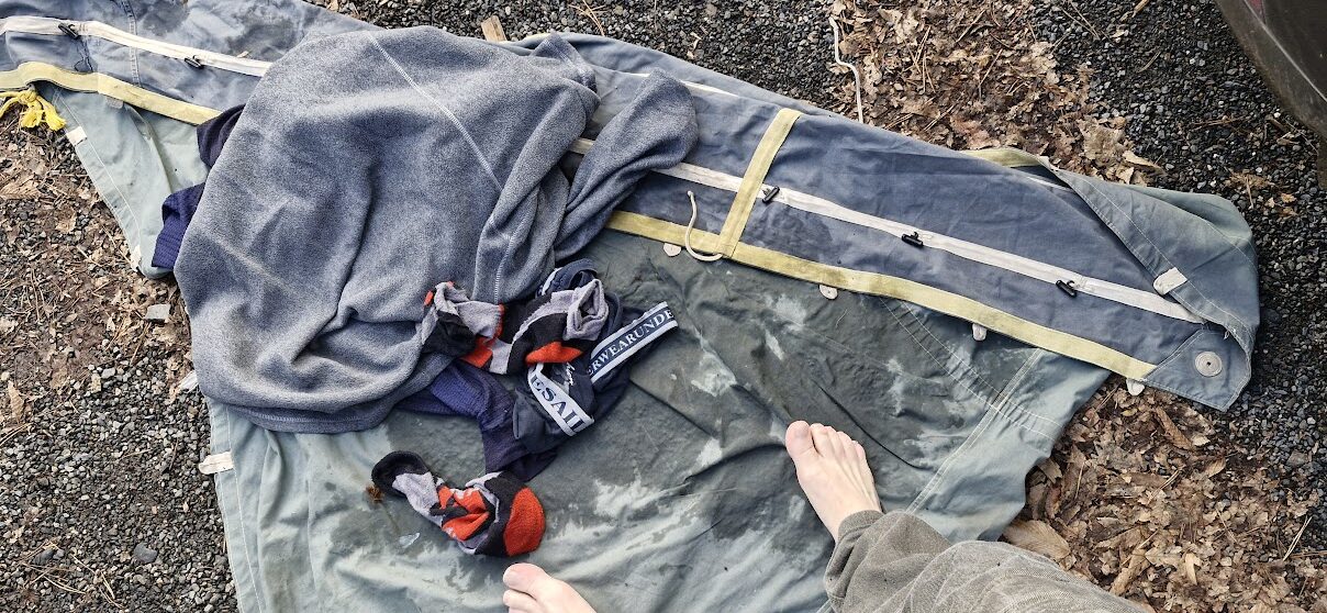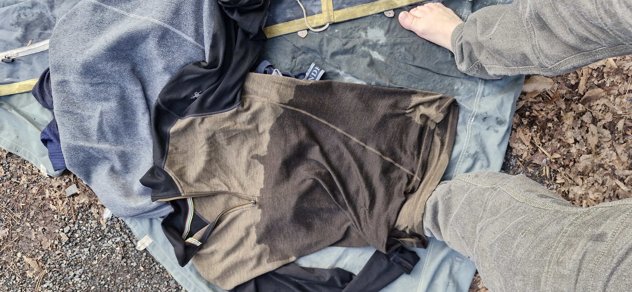 Roztahuji na zem celtu a pokládám na ni svlečené mokré věci z pod suchého obleku. Jsou navlhlé výrazně víc, než jsem pocitově předpokládal.