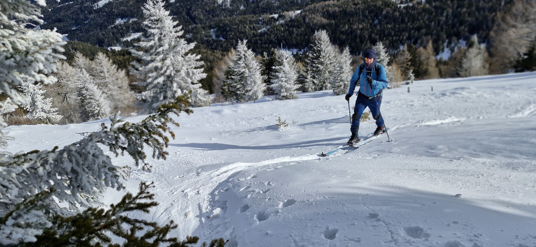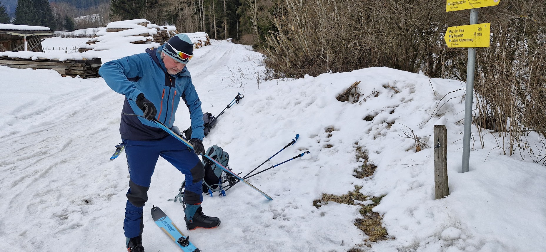 Ve středu se vydáváme s Milanem na výstup na Aineck. Ostatní jdou jezdit na sjezdovku. Šlapeme na skialpových lyžích, čeká nás více než kilometrové převýšení a 20 km po stezkách, které jsem vytipoval podle mapy.