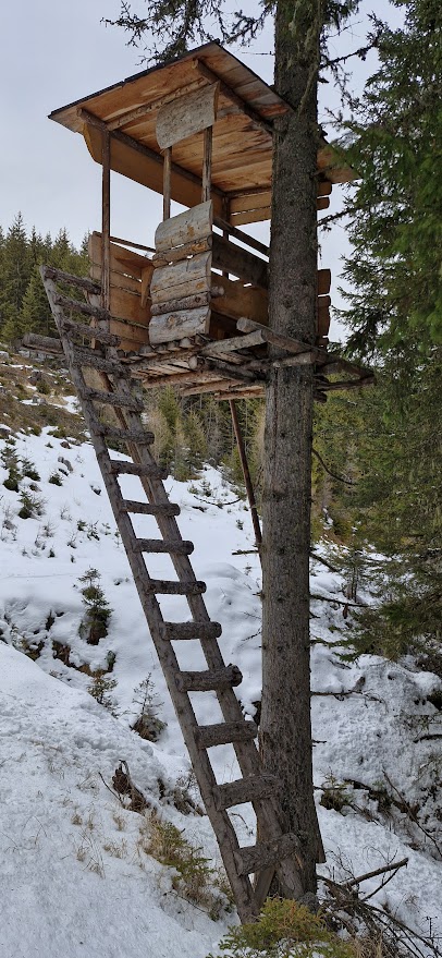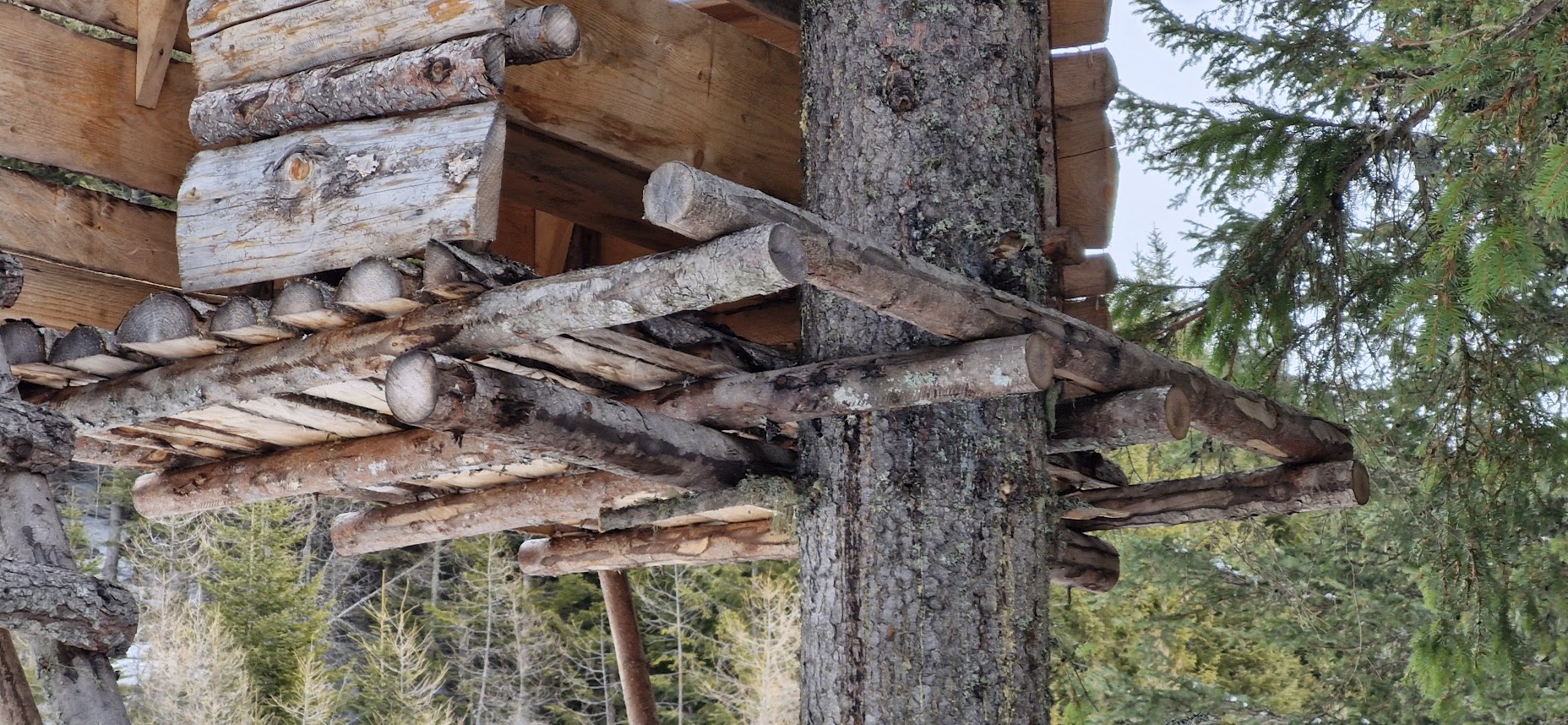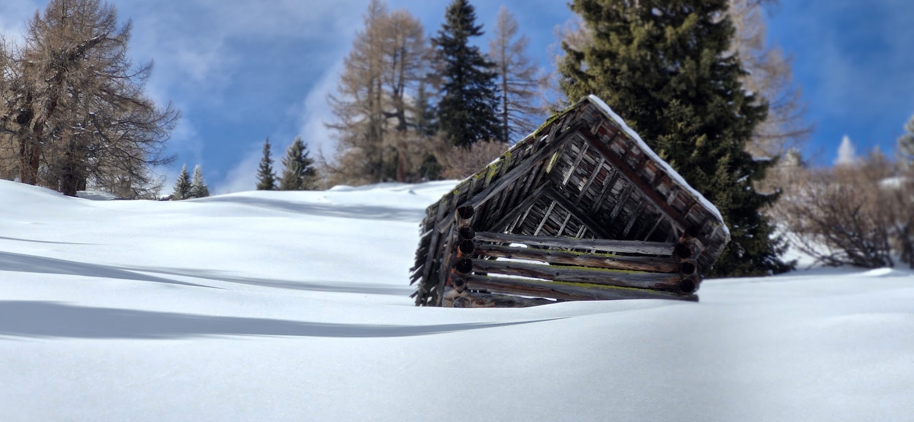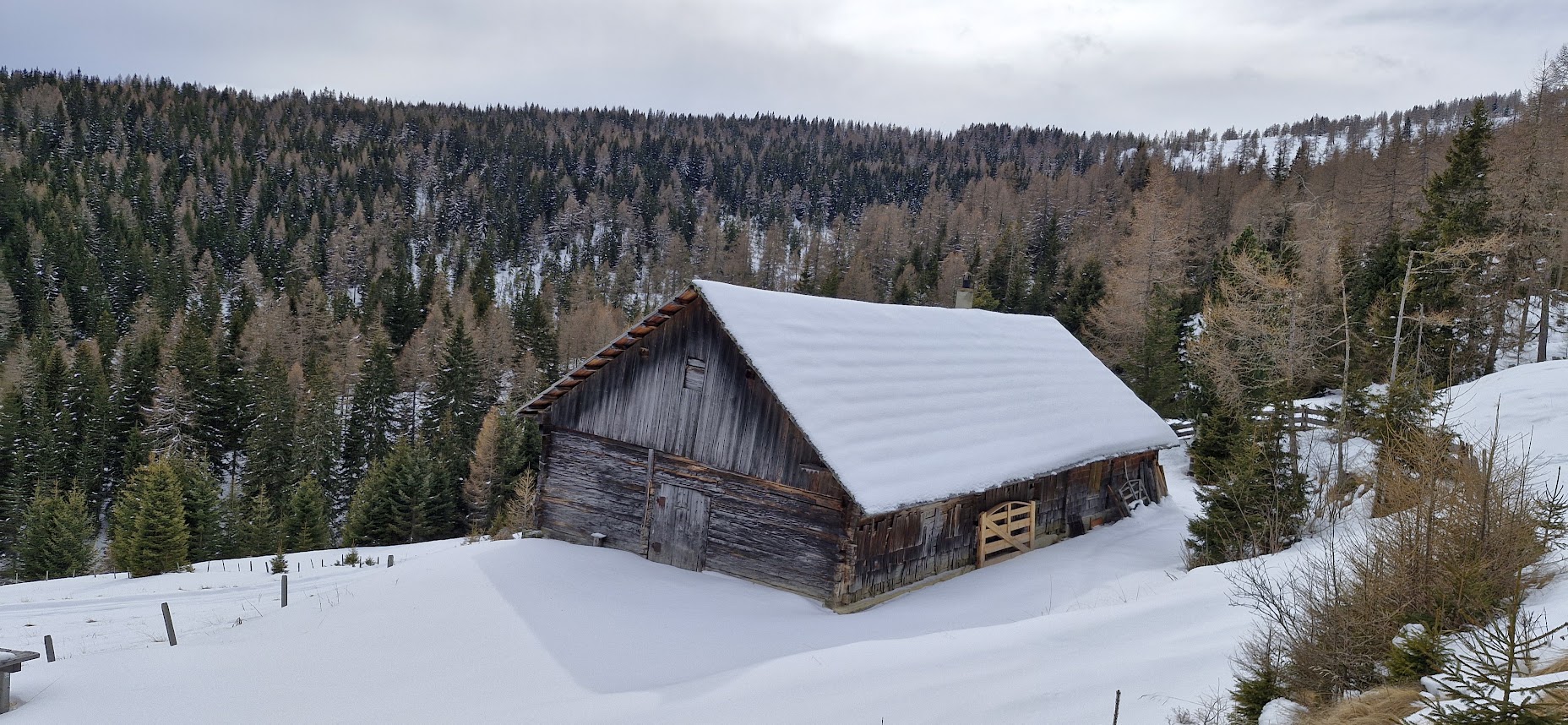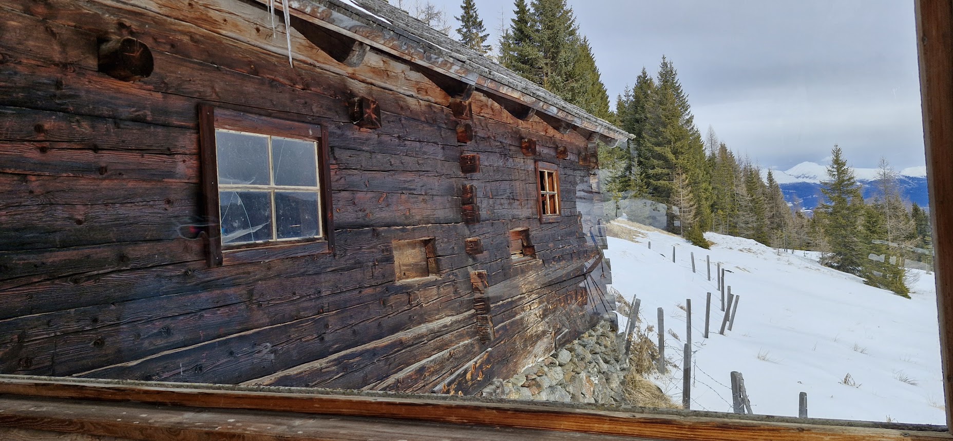 Když vystoupáme nad hranici pásma souvislého lesa, otevírají se před námi pastviny a dvě tradiční alpské seníkové stavby. Narozdíl od velkého hospodářského stavení, které je o 200 výškových metrů níže, tohle nebyla žádná obytná chaloupka, ale sezónní hospodářský objekt určený ke skladování sena. Je to tradiční roubená stavba z kulatiny. Trámy jsou kladené vodorovně a spojované v rozích přes klasické tesařské spoje, bez kamenného soklu jak se zde takovéto tradiční horské stavby v 18.–19. století budovaly.
