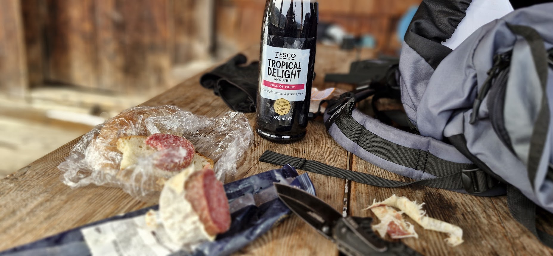 Tohle stavení je sice udržované, ale využívá se jako rekreační objekt. Elektřinu tu zajišťuje solární panel, kadibudka je kousek pod chalupou. K původnímu stavení majitel dostavěl otevřenou krytou verandu s lavicemi i stolem a s krásným výhledem do údolí. Sedáme na suché lavice a díváme si malou svačinku, přestože hlad nemáme. Ale je právě pravé poledne a není pravděpodobné, že cestou na vrchol Ainecku (ještě cca 2 hodiny) narazíme mimo pásmo lesů na možnost si v závětří pohodlně sednout a pojíst.