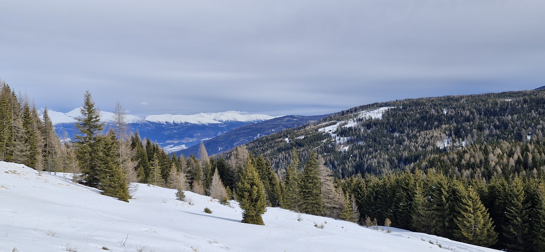 Při stoupání se s Milanem rozdělujeme, on míří přímo na Aineck, já odbočuji víc doleva k vrcholku Theuerlnock (2145 m), který je vzdušnou čarou 1,5 km od Ainecku (2210 m). Domlouváme se, že se potkáme nahoře u lanovky nebo v půli sjezdovky v tamní hospodě, kde si dáme horkou gulášovou polévku.
