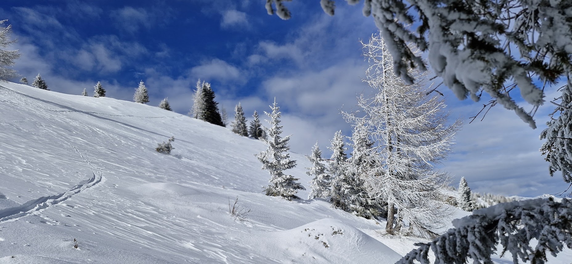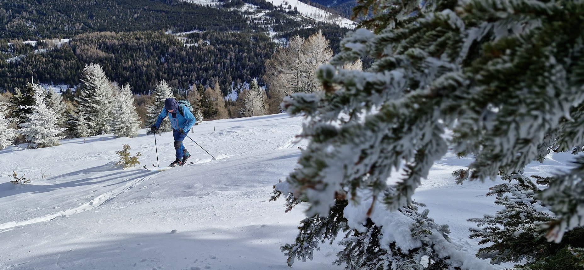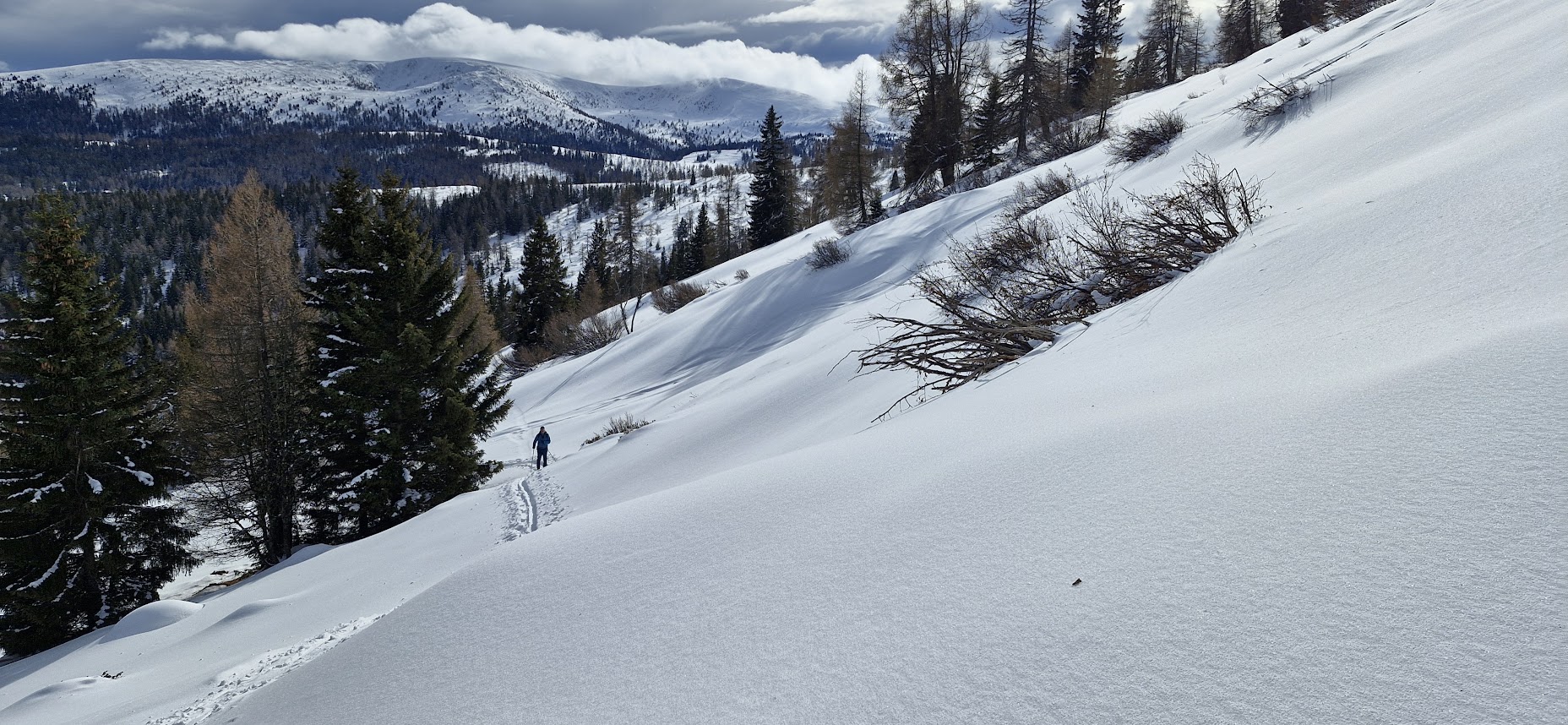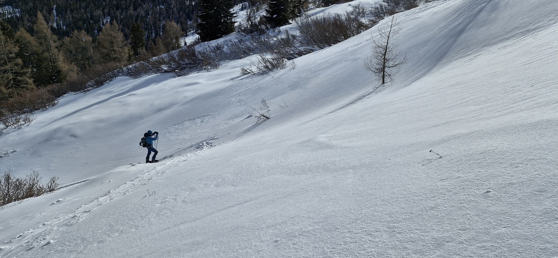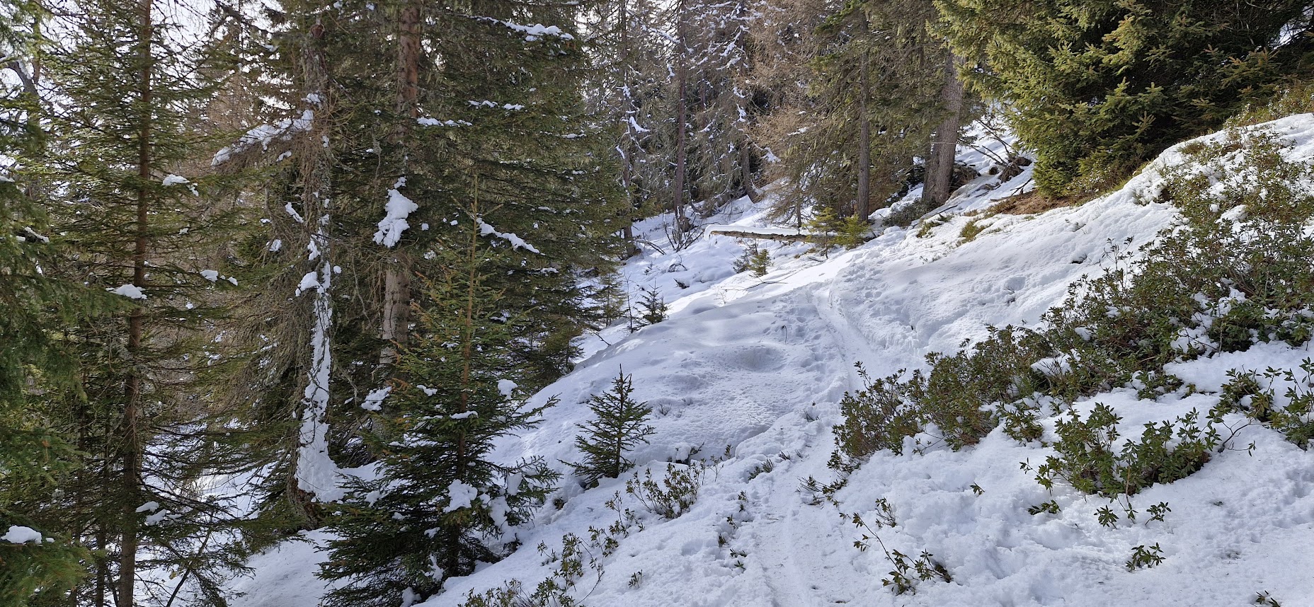 Prošláplá stopa vede chvílí přímo do svahu, jindy traverzuje řídkým lesem odolných alpských smrků, ošlehaných nemilosrdným vysokohorským větrem. Místy tu jsou metrové návěje, místy ostrůvky hnědé trávy. Čím výše stoupáme, tím méně travnatých ostrůvků míjíme.