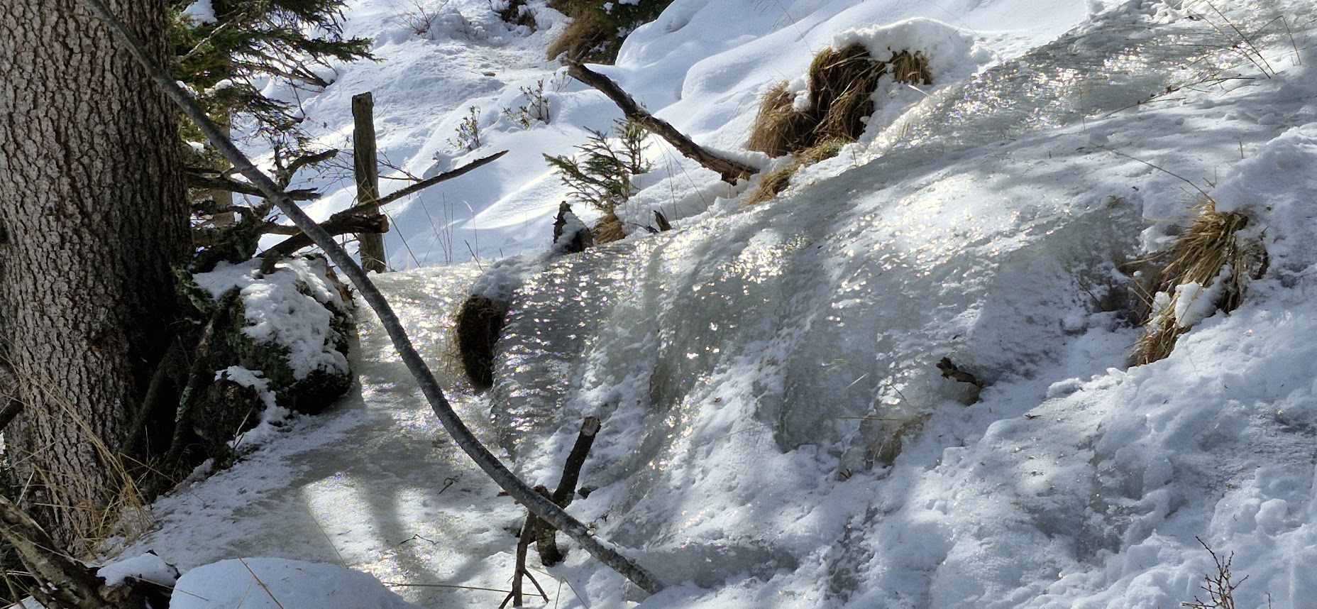 Několikrát musíme překonat několikametrové ledové plochy skrytých pramínků rozesetých po východní straně Ainecku. S každým výškovým metrem je les řidší.