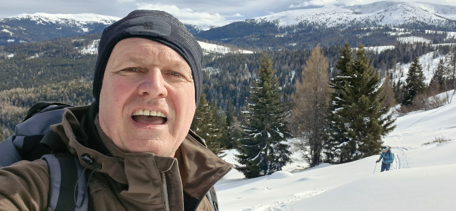 Vidím, že Milan, který je kousek pode mnou, je na tom stejně jako já. Nebýt jeho, skialpovou výbavu bych si nepořídil a ani na lyže sem do Gurktalských Alp bych se nevydal. Tahle akce je sice proti potulce na Velké Fatře brutálně mastňácká, ale musím uznat že ta nádhera a krása kolem za to snížení se stojí :- )