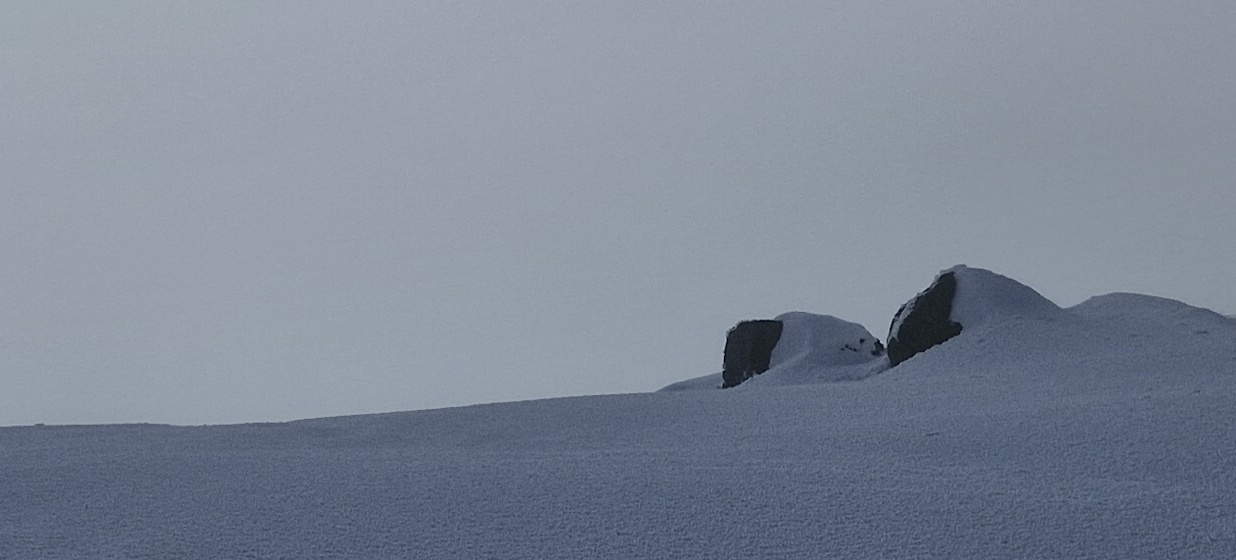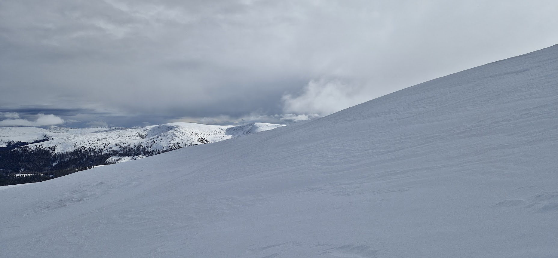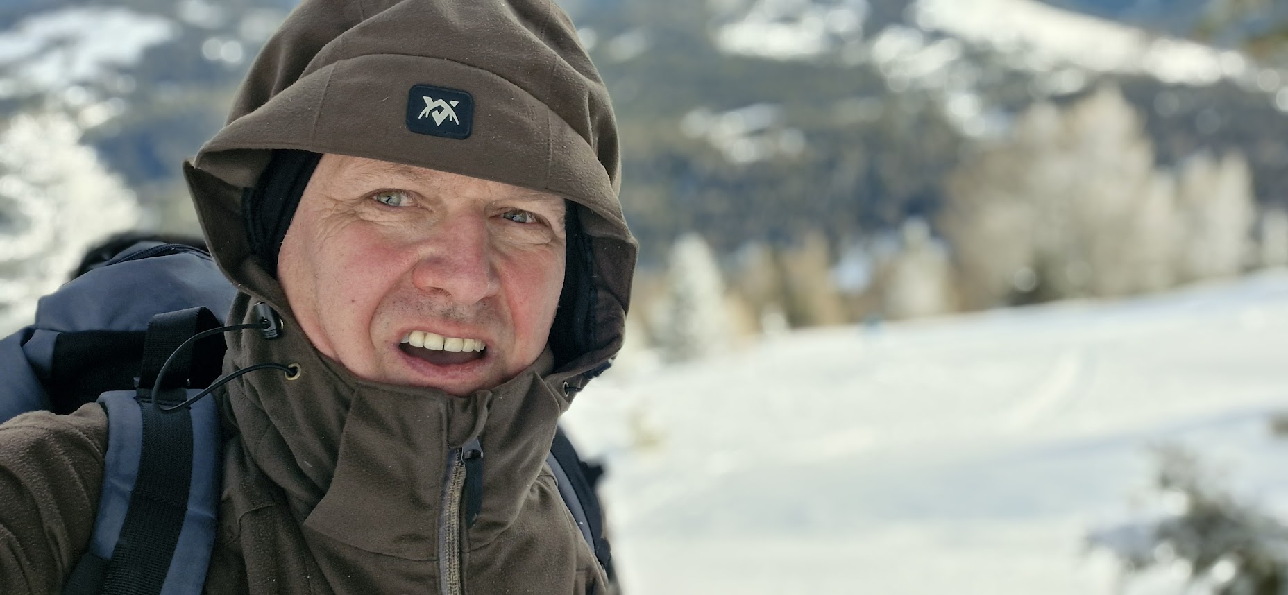 Při pomalém stoupání prohlížím zkušeným okem okolí a říkám si, kde by šlo nejlépe přenocovat ve žďáráku, protože na záhrab tu není dostatek sněhu. Při tomhle větru by to nebyla nejklidnější noc, ale protože jsem pár takových už zažil, říkám se, že by to tu šlo : -)