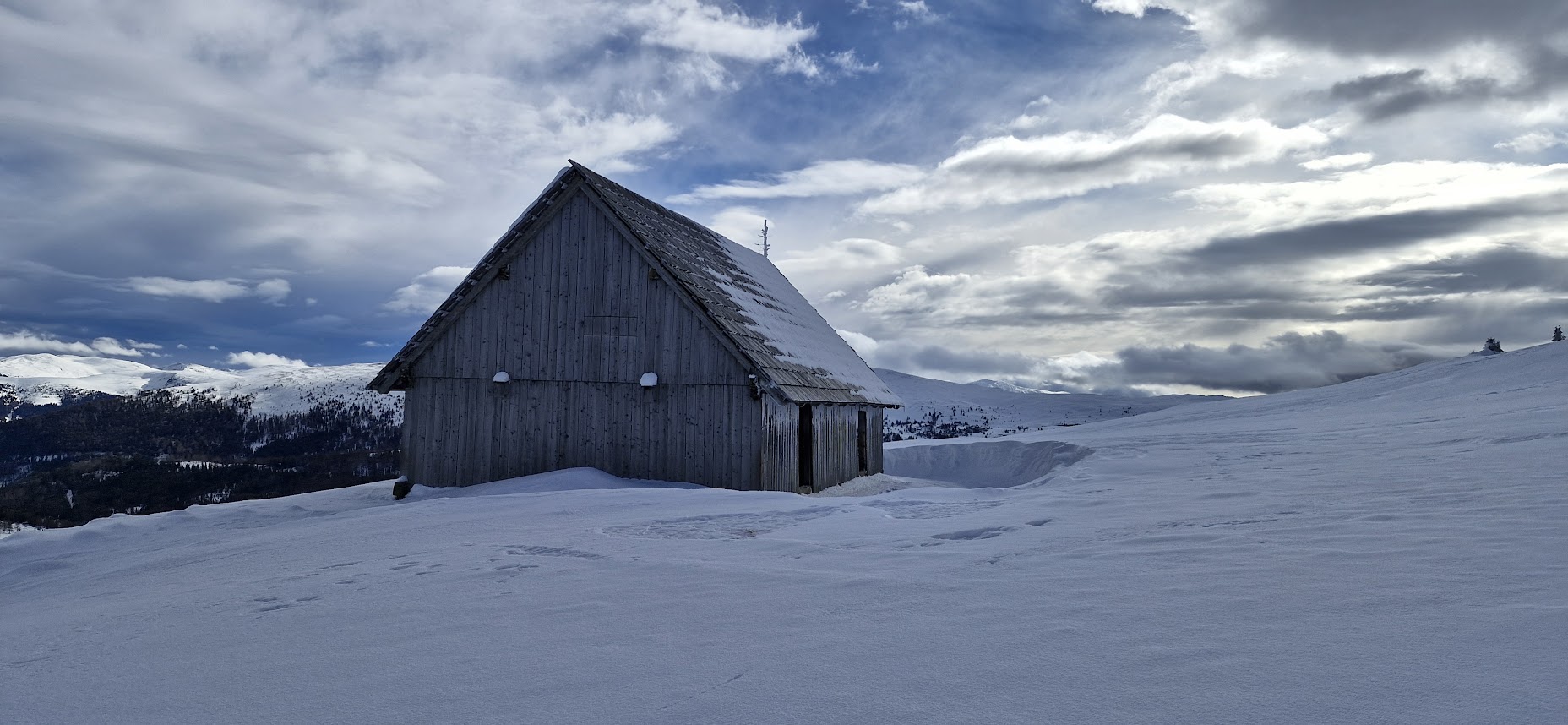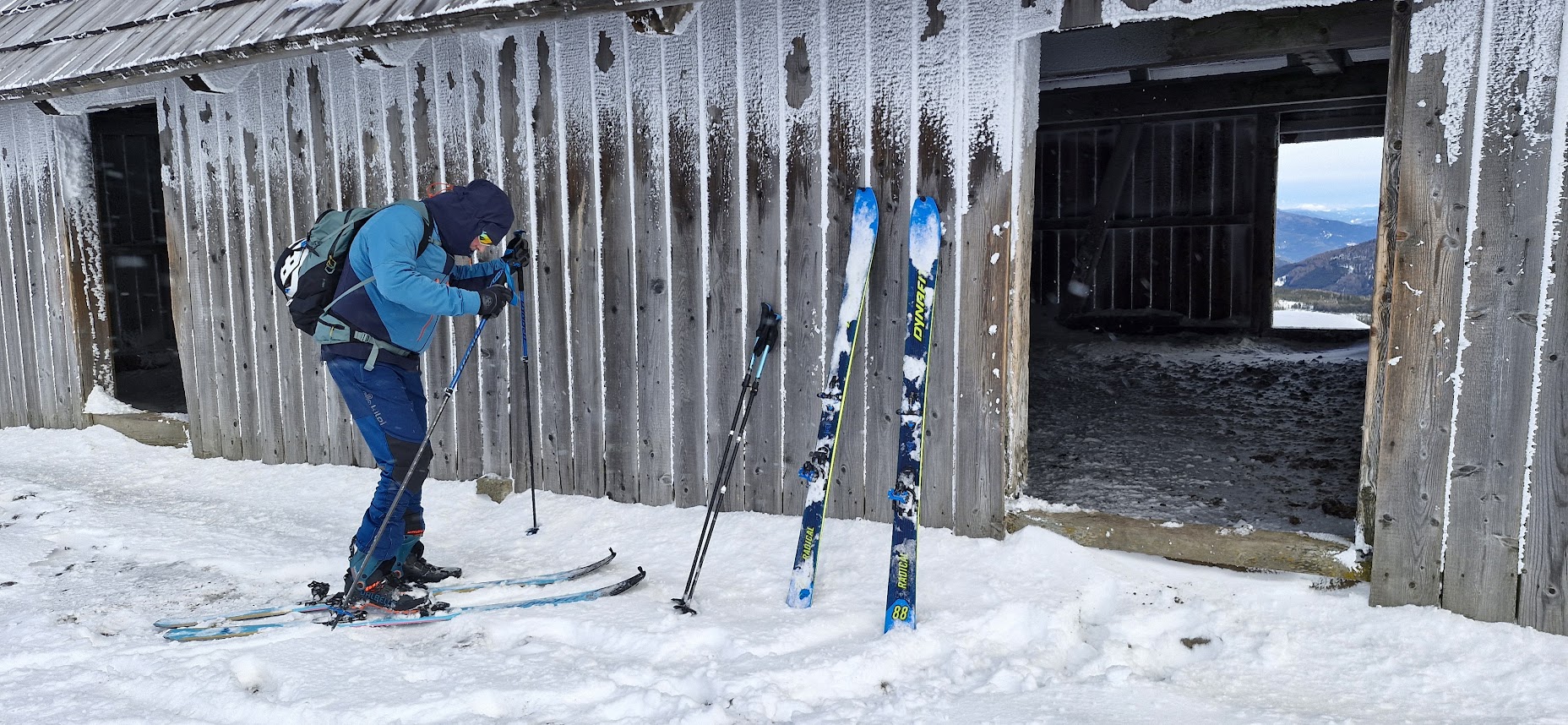 Z výšky 1600 m.n.m., kde tahle dřevěnice stojí, se vydáváme po několika kilometrech traverzu svahem přímo nahoru, abychom vystoupali do 2210 m. Máme štěstí, kdosi tudy před pár dny stoupal na skialpech před námi, takže jednak nemusíme stopu prošlapávat, ale hlavně nemusíme pátrat kudy by bylo nejlépe stoupat.