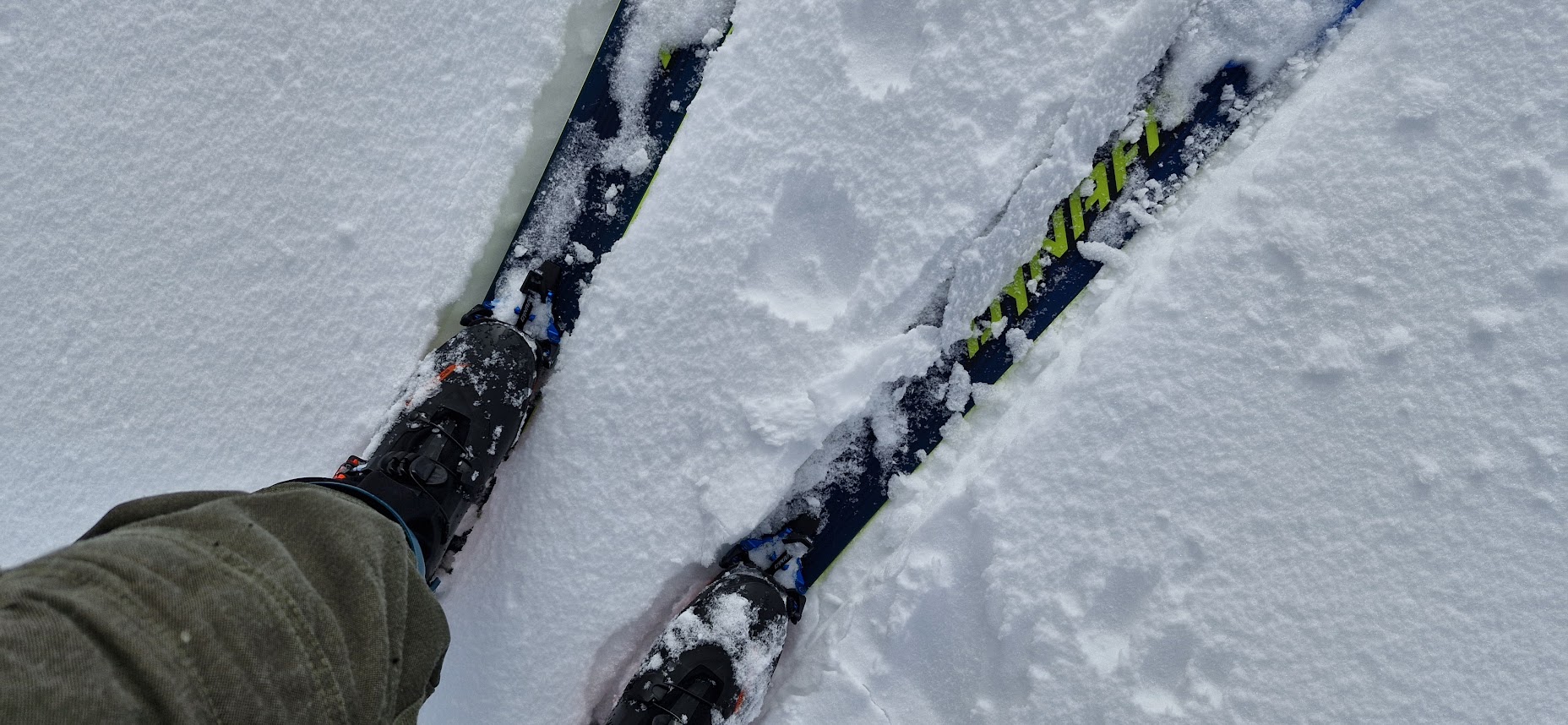 Když si ve 14:45 zalezu do závětří uvnitř stanice, abych si vytáhl z báglu helmu a brýle, cítím úlevu. Výš už stoupat nebudu. Odsud budu těch víc než 1150 výškových metrů jen sjíždět :- ) Když z lyží sundávám tulení pásy, přichází Milan, který si odskočil 200 metrů k lanovce na druhé straně hřebene. Pomáhá mi odtrhnout špatně složený pás, sundává si svoje pásy a jedeme cca 6 km sjezd dolů.